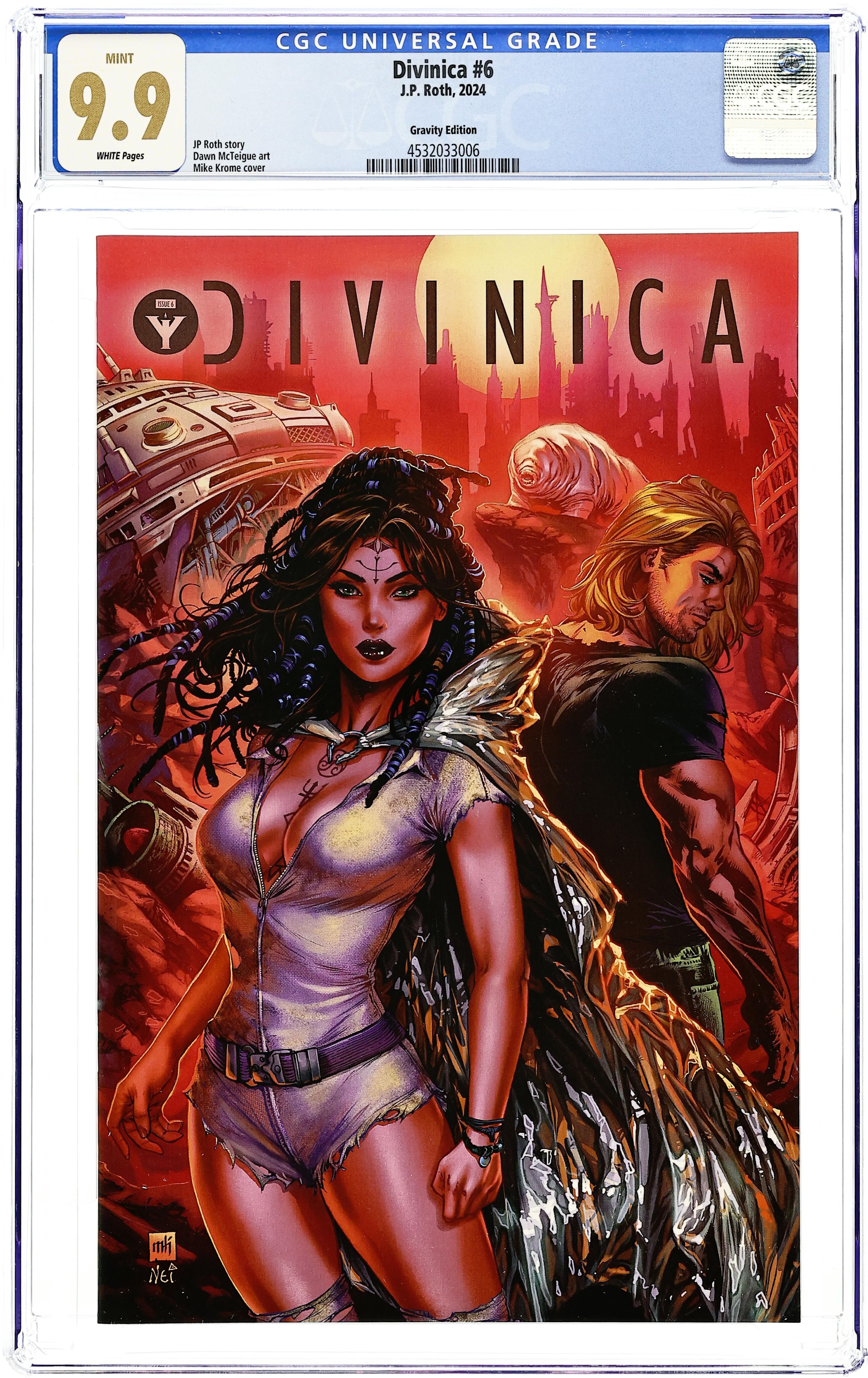 Ended Sep 11 2025 Winning Bid $26 Gravity Edition Variant Cover by Mike Krome. Written by J.P. Roth. Art by Dawn McTeigue. Astral travels, forgotten goddesses, and a mysterious Sky Lord. Divinica's world grows stranger as the Red Wave approaches. 28 pages. full color. Grade: CGC 9.9 explanation of grade Condition: Used (collectible)