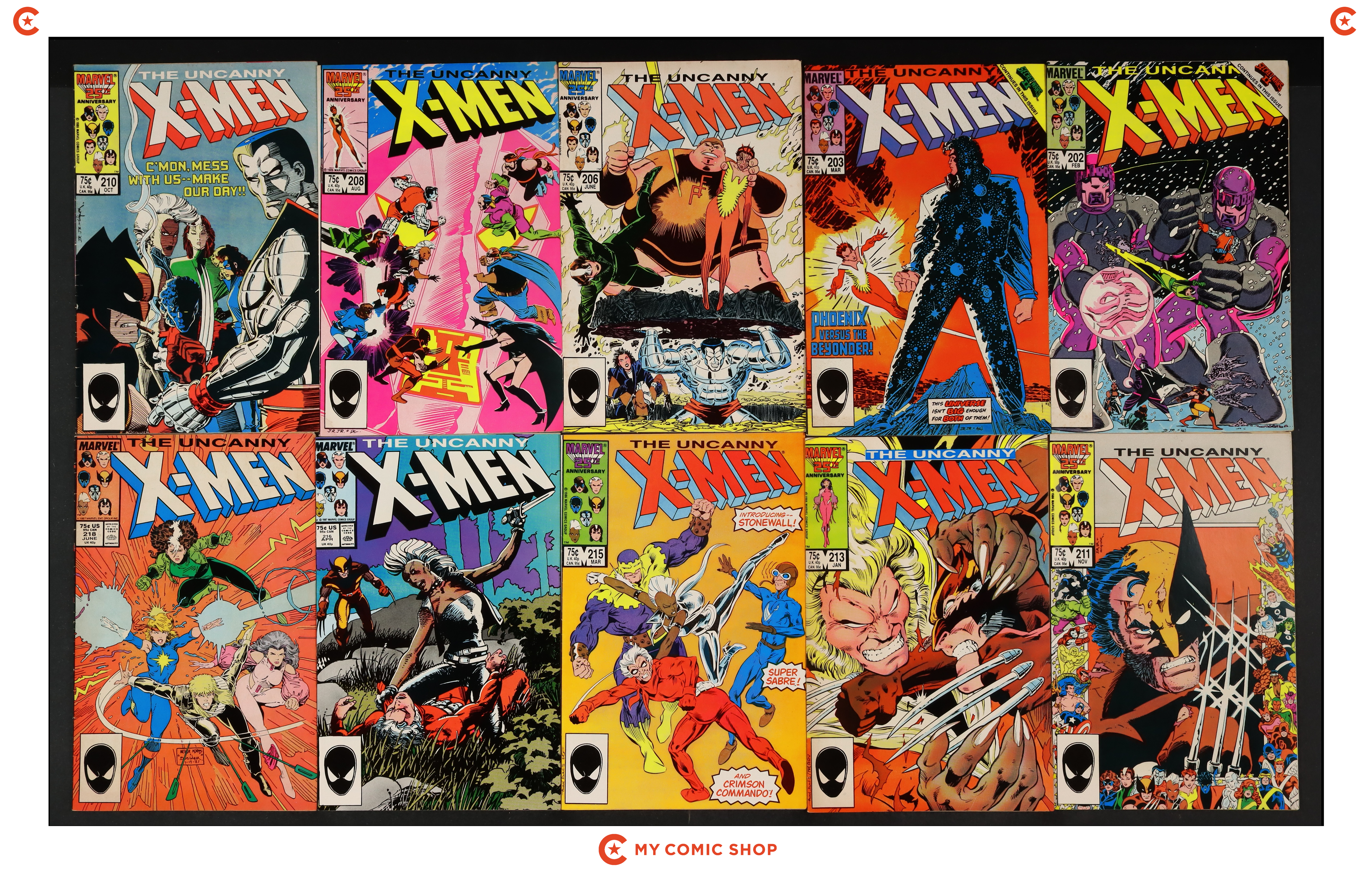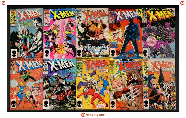 Issues 202, 203, 206, 208, 210, 211, 213, 215, 216, and 218 of Uncanny X-Men (1963 1st Series). Most will grade in the FN to VG range.