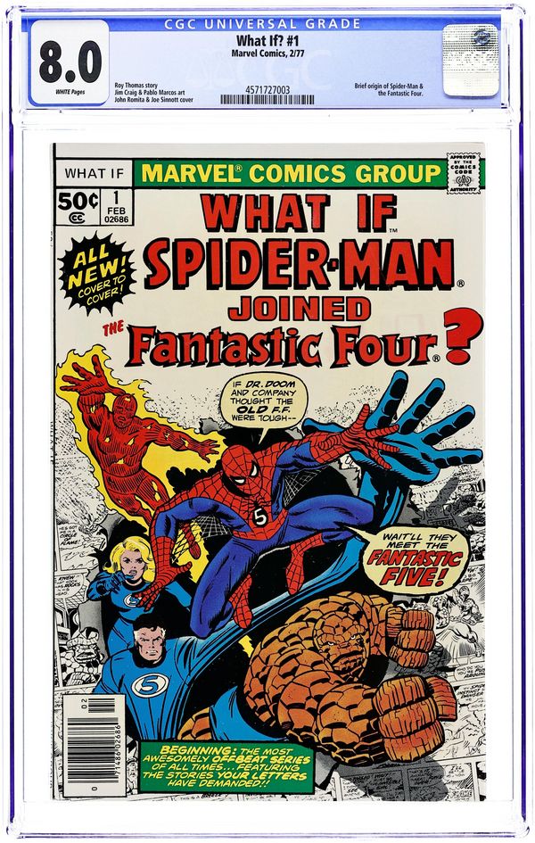 Cover by Ron Wilson and Joe Sinnott. What if Spider-Man Joined the Fantastic Four? Script by Roy Thomas, pencils by Jim Craig, inks by Pablo Marcos; Spider-Man becomes a member of the FF; Cameos by Killraven, the Squadron Supreme, and Deathlok. Hostess Fruit Pie ad with the Hulk, pencils by Dave Cockrum. Ad for Richochet Racers with Spider-Man and Captain America. Roy Thomas discusses how the title came about. 52 pgs. Cover price $0.50. Grade: CGC 8.0 explanation of grade Condition: Used (collectible)