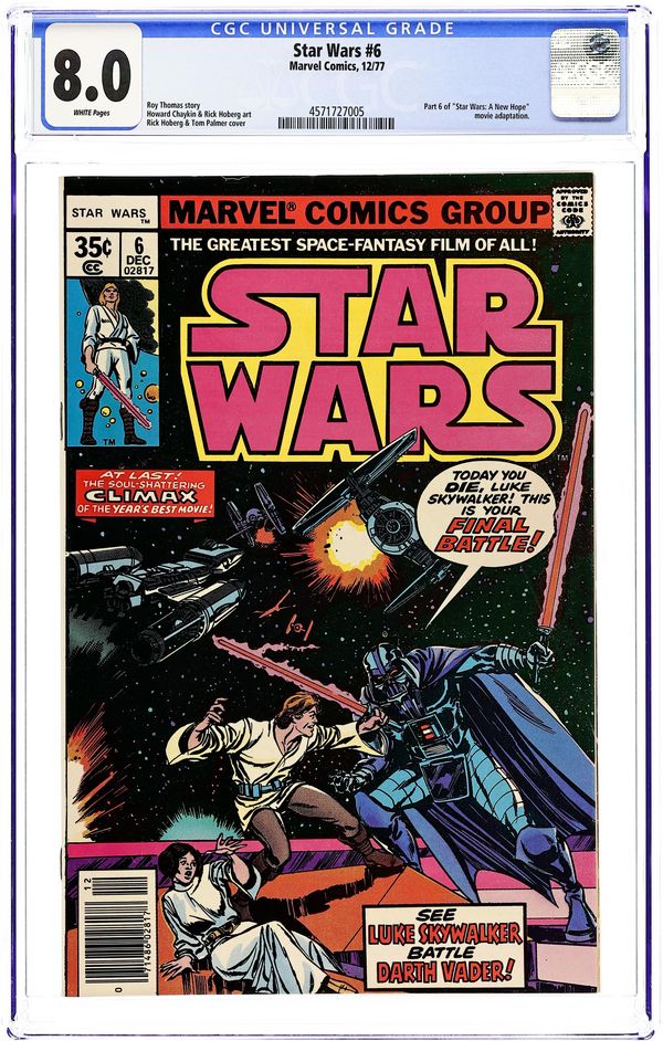 1st printing, standard 35 Cent Newsstand Edition with UPC. A New Hope: Part 6 of 6. "Is this the Final Chapter?!" Based on the screenplay by George Lucas. Adapted by Roy Thomas. Art by Howard Chaykin, Rick Hoberg, and Bill Wray. This is it, the explosive conclusion to the biggest space epic of all time! Armed with the secret plans, the Rebel Alliance mounts an all out attack on the evil Empire's ultimate weapon, the Death Star. However, they'll have to break through the monstrous space station's own defenses and dozens of deadly Tie-Fighters to get to its weak point. As the Rebels' time begins to run out, and their fleet of X-Wing Fighters begins to dwindle, it falls upon young Luke Skywalker and the power of the force to save the day. But first he'll have to get past the most dangerous man in the galaxy - Darth Vader! Cover price $0.35. Grade: CGC 8.0 explanation of grade Condition: Used (collectible)