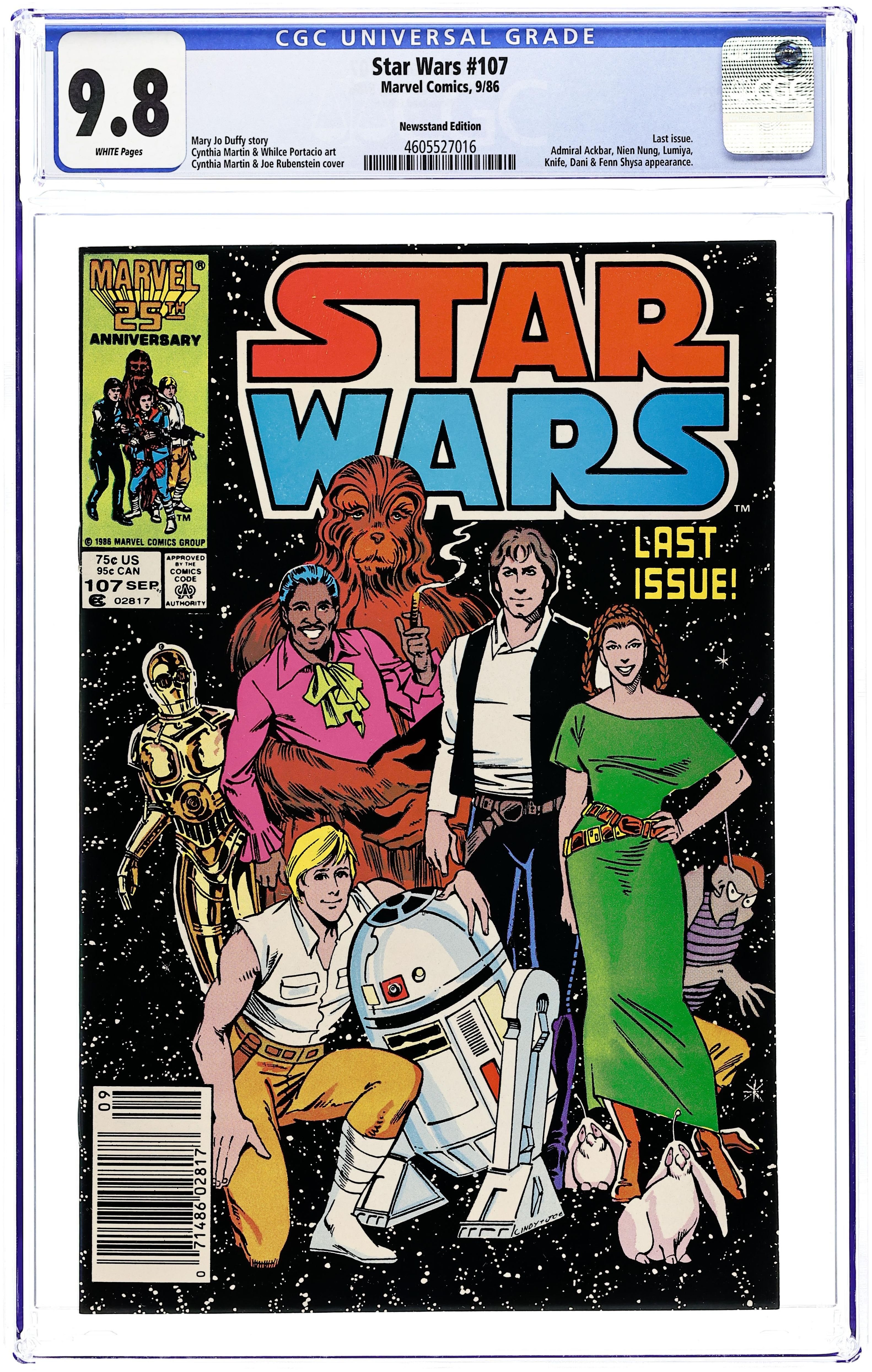 Newsstand Edition. Final issue. A not-so-merry band of former imperials, former rebels, Mandalorians, Zeltrons, droids and Nagai are on Saijo on a mission to capture the Tof prince in "All Together Now". Script by Jo Duffy, pencils by Cynthia Martin, inks by Whilce Portacio.(scarce) Cover price $0.75. Grade: CGC 9.8 explanation of grade Condition: Used (collectible)