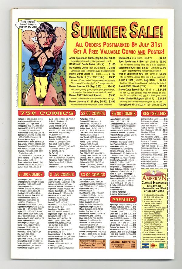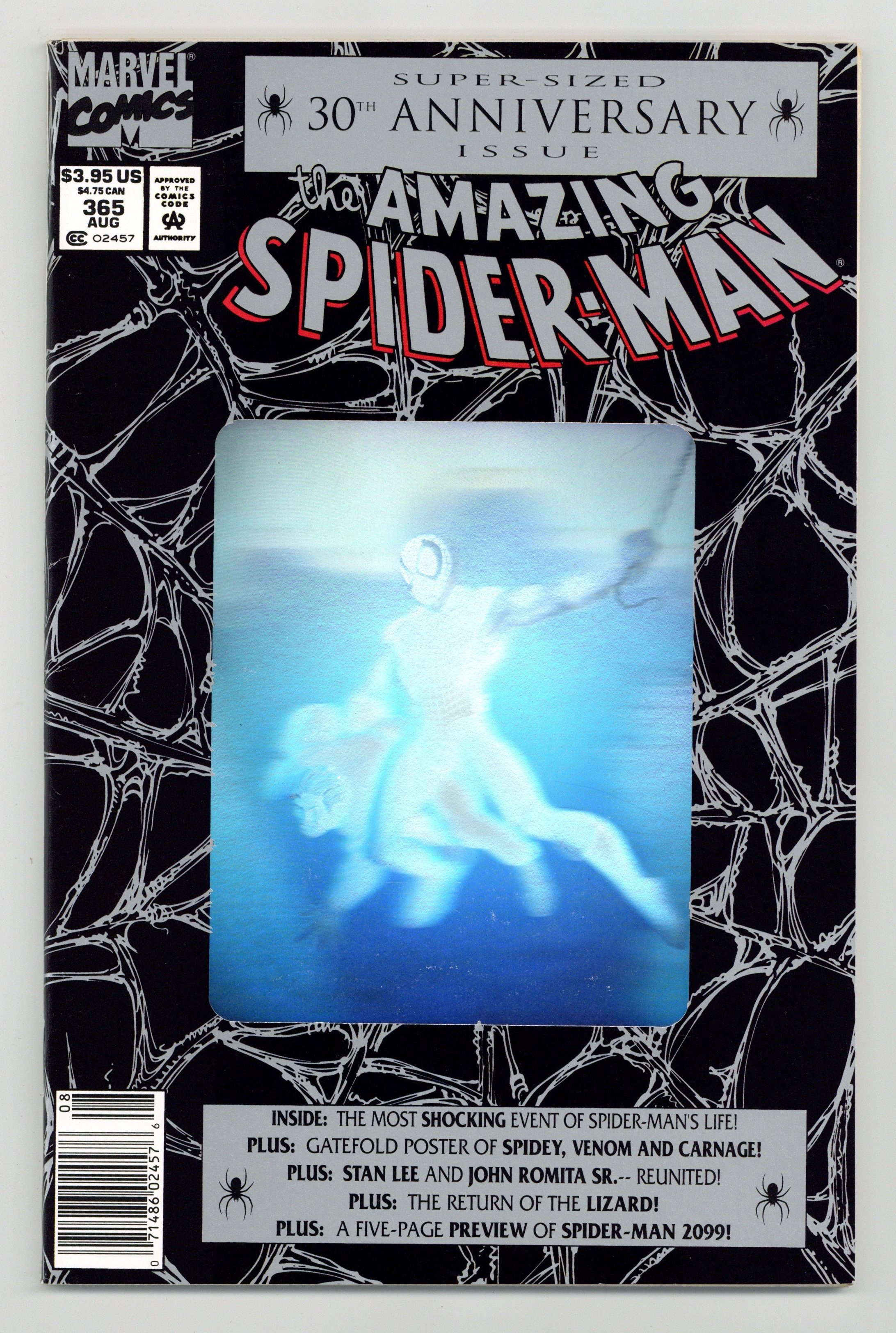 Starts Feb 9 Newsstand Edition. 80-page giant 30th Anniversary issue, with the first appearance of Spider-Man 2099! The Lizard returns in "Fathers and Sins." Script by David Michelinie, pencils by Mark Bagley, inks by Randy Emberlin. J. Jonah Jameson is featured in "How I Created Spider-Man!" Script by David Michelinie, art by Aaron Lopresti. Gwen Stacy takes center stage in "I Remember Gwen." Script by Stan Lee, plot by Tom DeFalco, art by John Romita Sr. (Cameos by the Green Goblin and Doctor Octopus.) The Prowler is also here in "A Friend in Need." Script by Tom DeFalco, pencils by Tod Smith, inks by Andrew Pepoy. There are also two text pieces, "The Saga of Spidey's Parents" by Stan Lee, and "Spider-Man: The First Thirty Years" by Peter Sanderson. Spider-Man 2099 gets a sneak preview, with a script by Peter David, pencils by Rick Leonardi, and inks by Al Williamson. This issue was originally released with a fold-out poster of Spidey versus Venom and Carnage (poster may be missing in lower grades). 84 pgs. Cover price $3.95. Grade: VF 8.0 explanation of grade Condition: Used (collectible)