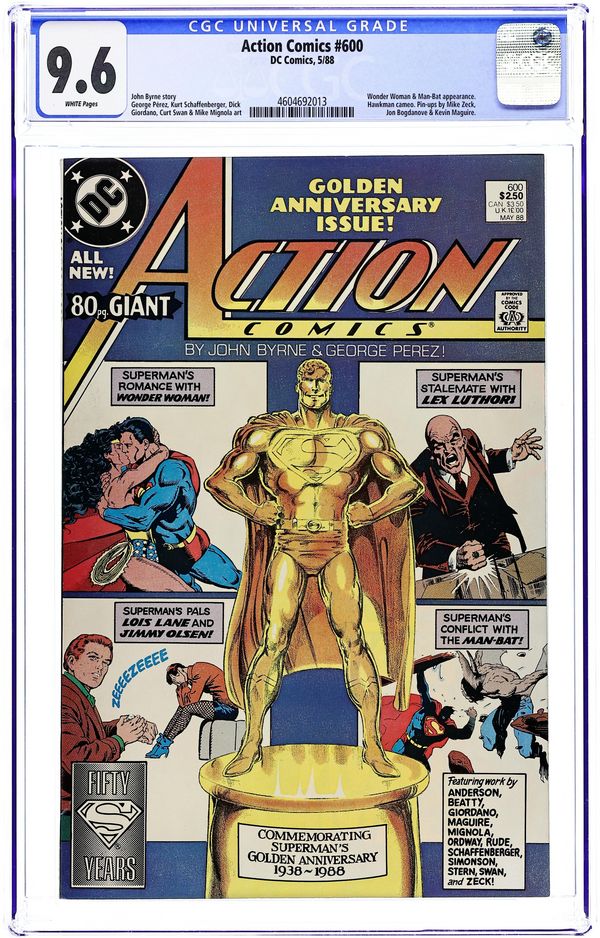 Direct Edition. 80-page giant. Cover pencils by John Byrne, Kurt Schaffenberger, Dick Giordano, Curt Swan, and Mike Mignola, inks by George Perez, Jerry Ordway, John Beatty, Murphy Anderson, and Mike Mignola. Alternate Action Comics #600 cover, pencils by John Byrne, inks by George Perez. "Different Worlds!" script by John Byrne, pencils by John Byrne (breakdowns) and George Perez (finishes), inks by George Perez; Hermes summons Wonder Woman to Olympus from her romantic meeting with Superman, and the Man of Steel follows, but they arrive in different locations; After Hermes explains to Diana that Olympus has been taken over by Darkseid, the New God toys with the heroes, making them battle, as he discusses with Desaad his plans. "True Love!" script by John Byrne (plot) and Roger Stern (script), pencils by Kurt Schaffenberger, inks by Jerry Ordway; Lois is upset that the papers are saying that Superman and Wonder Woman are dating. "Games People Play!" Script by John Byrne, pencils by Dick Giordano, inks by John Beatty; Lex threatens to reveal to the public that Maggie is a lesbian; Lex learns that he has kryptonite poisoning. "A Friend in Need!" Script by John Byrne (plot) and Roger Stern (script), pencils by Curt Swan, inks by Murphy Anderson; Superman goes to Millersburg to answer Jimmy's signal watch, but weakens from kryptonite poisoning. "The Dark Where Madness Lies!" starring Superman and Man-Bat, script by John Byrne, pencils by Mike Mignola, inks by Mike Mignola. Comics Buyer's Guide Fan Awards for 1987. Kevin MaguireDave Gibbons, Walt Simonson, and Mike Zeck pin-ups; Art Adams pin-up inks. 84 Pages, Full Color, $2.50 Cover price $2.50. Grade: CGC 9.6 explanation of grade Condition: Used (collectible)