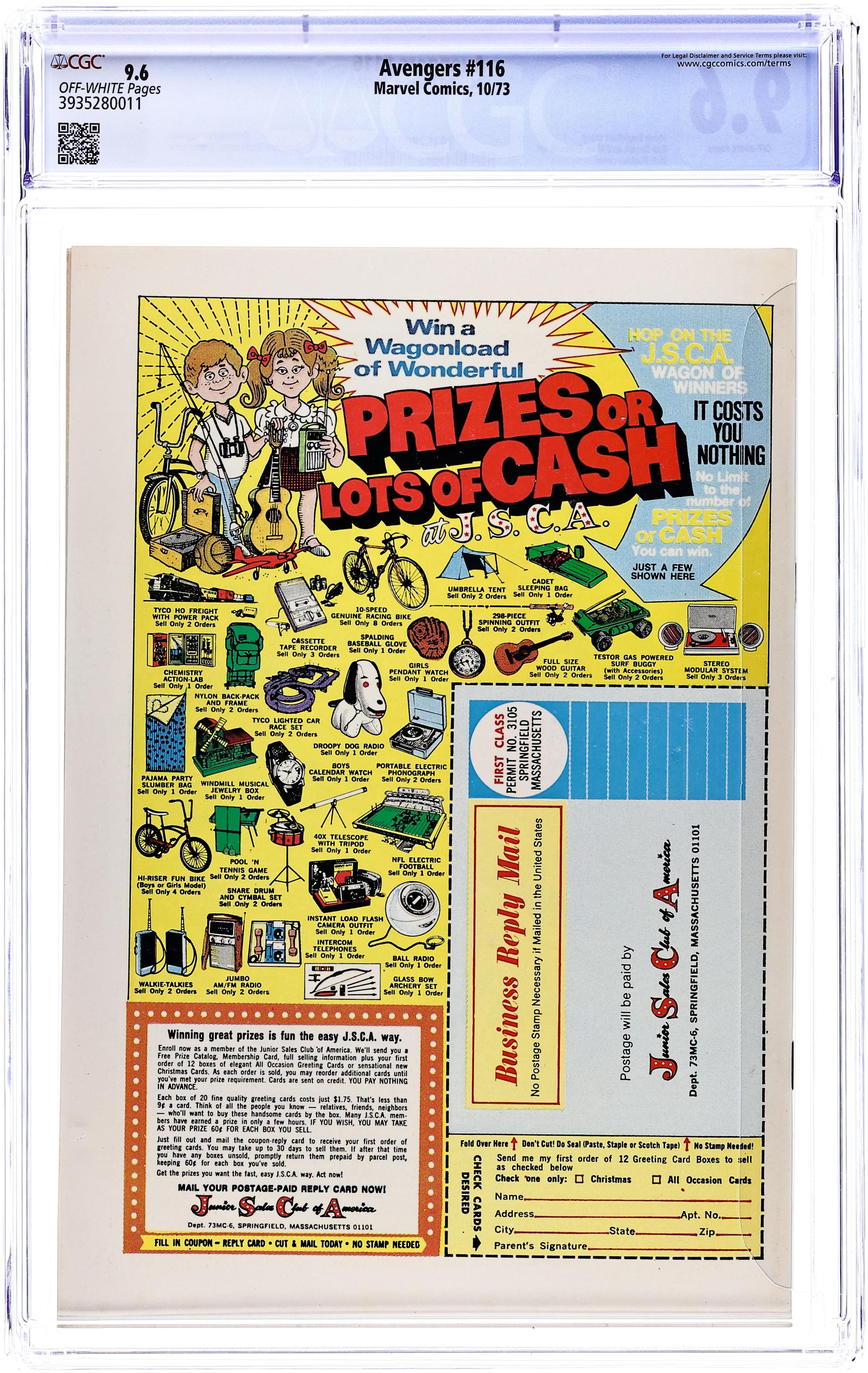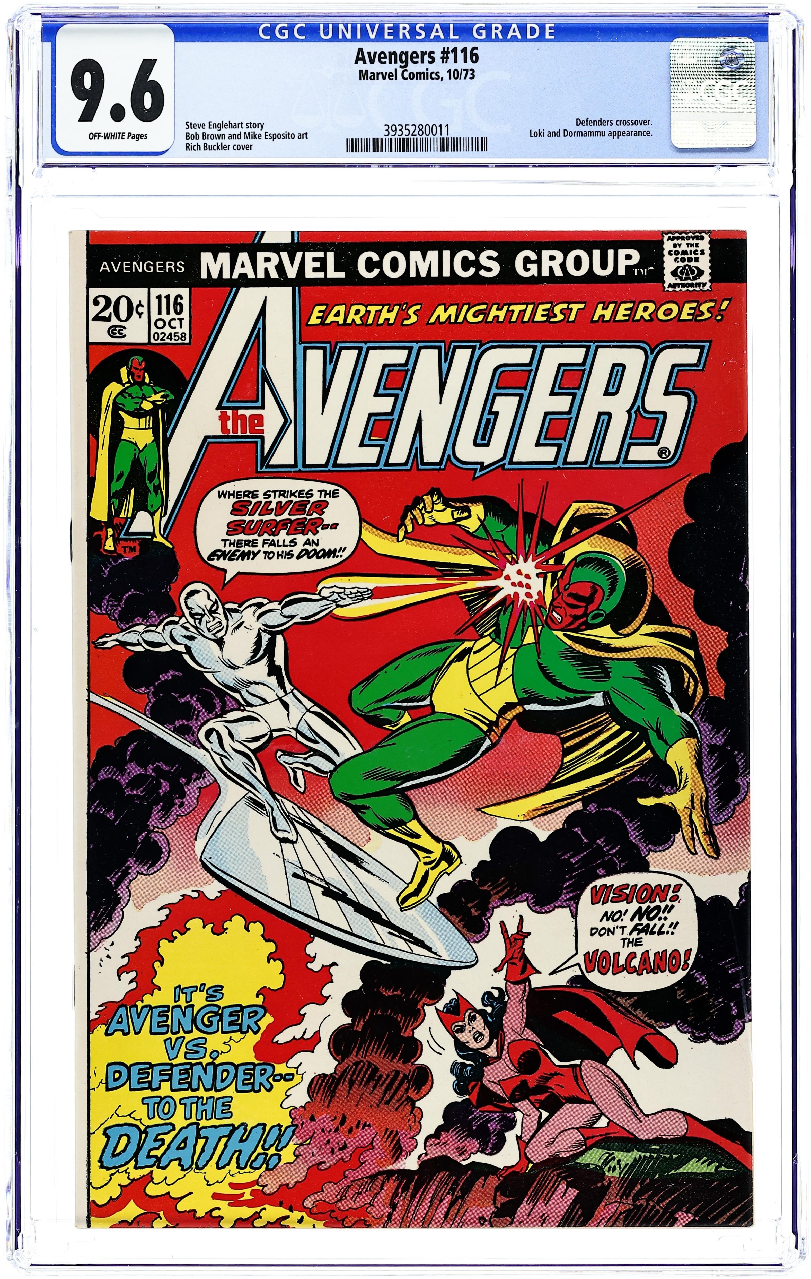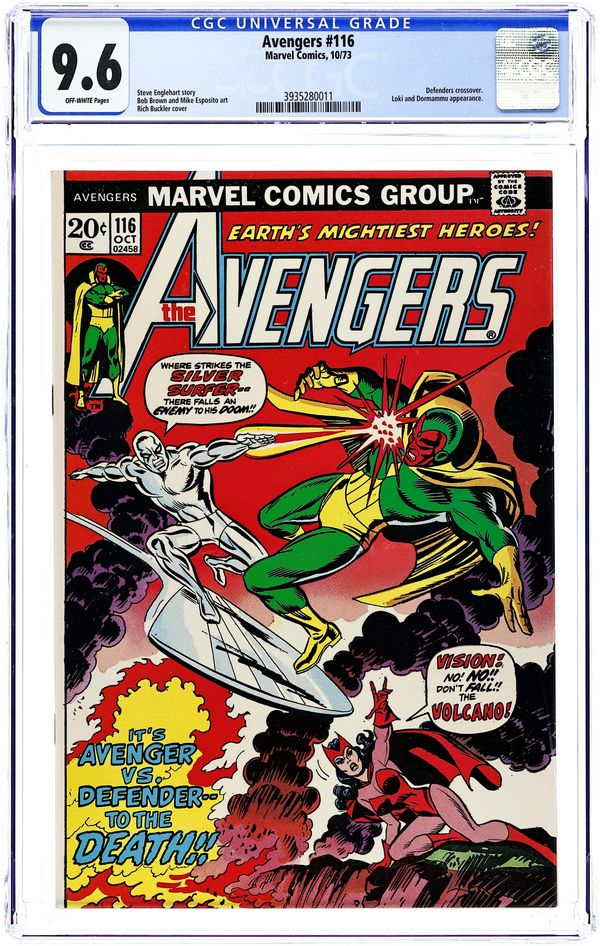 "Betrayal!" Avengers-Defenders crossover. Part 3 of 8. Guest-starring the Defenders. Script by Steve Englehart. Pencils by Bob Brown. Inks by Mike Esposito. Cover by John Romita and Mike Esposito. Story continues from Defenders 8. Earth's Mightiest Heroes visit Dr. Strange's townhouse in Greenwich Village and request permission to enter, but Wong slams the door in their faces! After an angry Thor breaks down the door, the Avengers storm inside, but a mystic spell sweeps them back out onto the street! Meanwhile gathered around the Orb of Agamotto, the Defenders put together a plan to find the six pieces of the Evil Eye. However, in the dark realm, Loki has grown suspicious of his dreadful ally! And contacts the Avengers to tell them about the Defenders' search for the ancient instrument from Avalon! So the die is cast! And the blockbuster battles are about to begin! Flashback cameos by Prester John, Wyatt Wingfoot, and the Human Torch to recap the history of the Evil Eye. Next Chapter: "The Silver Surfer vs. the Vision and the Scarlet Witch" The Avengers-Defenders Clash kicks into high gear as members of both teams span the globe to searching for the Evil Eye! And the first showdown features two of the most popular Marvel super-heroes of the 1970's! The Silver Surfer arrives in French Polynesia and plunges into the island's indigenous volcano to look for the Evil Eye. But the cosmic sky-rider's probing triggers a volcanic eruption! The fiery blast knocks a passing quinjet out of the sky and nearly kills the Scarlet Witch! Needless to say, this act enrages the synthezoid avenger! And in the heart of the raging volcano, the Vision and the Silver Surfer fight for the Evil Eye! Story continues in Defenders 9. (Notes: The Evil Eye previously appeared in Fantastic Four 54. This issue includes a full-page survey for readers to complete and mail back to the Marvel bullpen. A reprint edition exists for this issue.) 36 pgs. Cover price $0.20. Grade: CGC 9.6 explanation of grade Condition: Used (collectible)