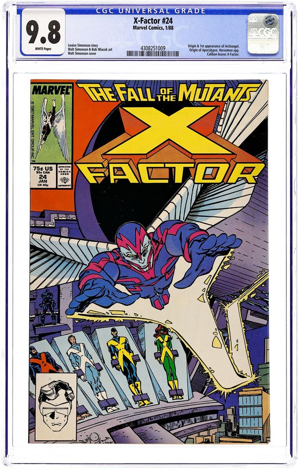 Direct Edition. Fall of the Mutants! Part 1 of 3. "Masks!" 1st full appearance of Archangel. Story by Louise Simonson. Art by Walter Simonson and Bob Wiacek. One of the biggest mutant events to ever hit the comic racks begins here. The powerful mutant known as Apocalypse finally makes his move and unleashes his Four Horseman on an unsuspecting world. The only thing standing between humanity and total annihilation is X-Factor. However when the fourth and final Horseman, Death, reveals his true identity, the group will be rocked to its very core. This is a pivotal chapter in the lives of the original X-Men. Cover price $0.75. Grade: CGC 9.8 explanation of grade Condition: Used (collectible)