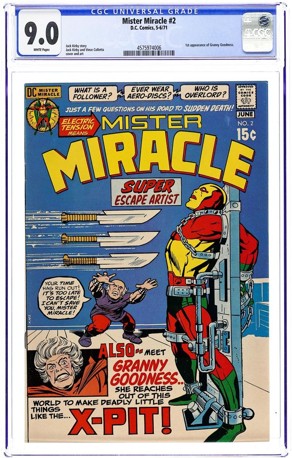 "X-Pit!" This action-packed issue finds Mister Miracle battling Overlord and escaping one trap after another. Features the introduction of Granny Goodness. Script, pencils, and cover by Jack Kirby. Inks by Vince Colletta. Cover price $0.15. Grade: CGC 9.0 explanation of grade Condition: Used (collectible)