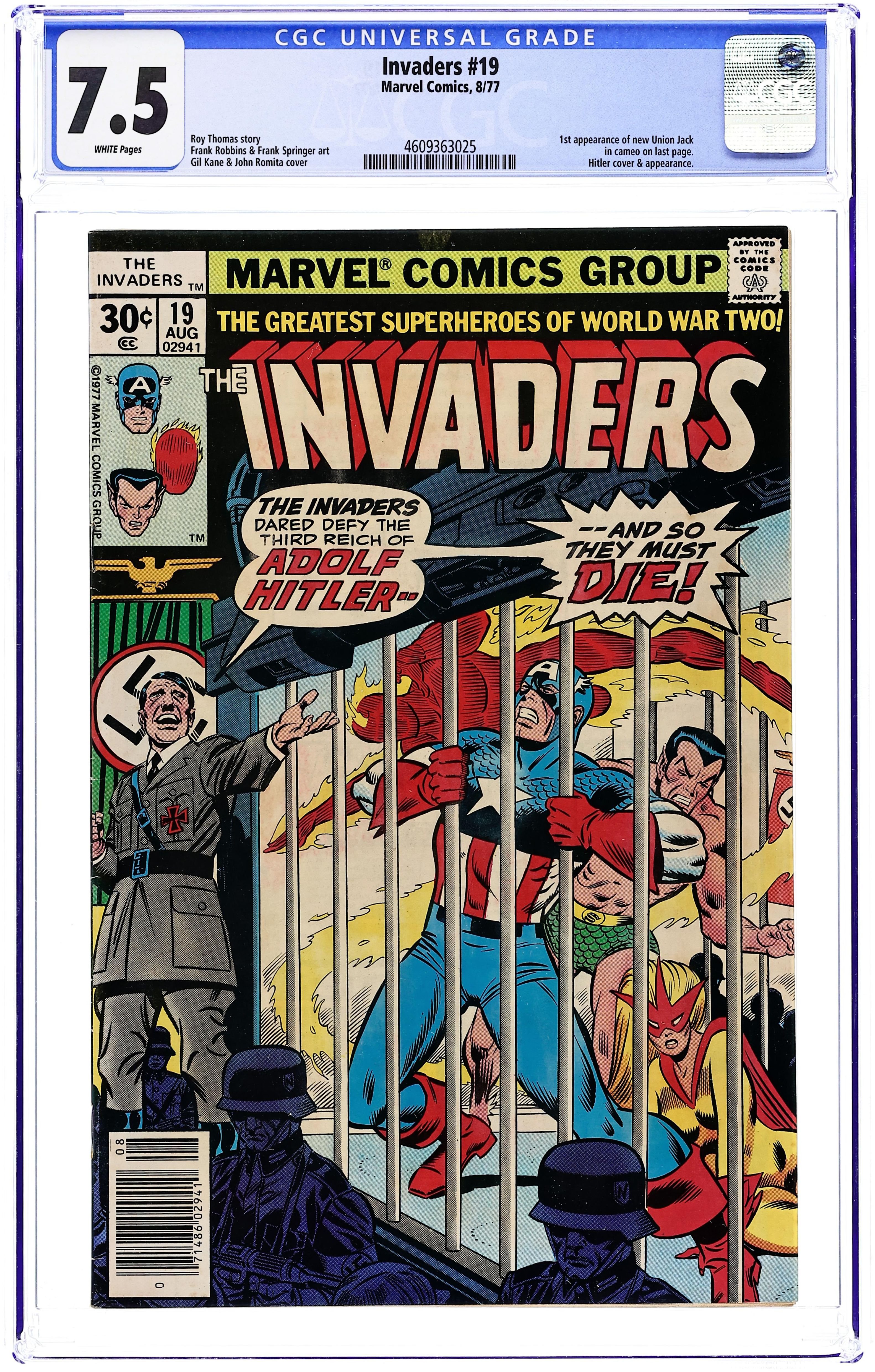 Ended Sep 22 2025 Bid History 8 bids Winning Bid $28 Part 4 of 6 - "War comes to the Wilhelmstrasse!" Guest-starring the Destroyer. Written by Roy Thomas. Art by Frank Robbins and Frank Springer. When the Invaders are captured by the Nazis, it falls to the neophyte heroine Spitfire, Dyna-Mite, the littlest hero, and Union Jack to save the day. 1st appearance cameo of Brian Falsworth as Union Jack II. Cover price $0.30. Grade: CGC 7.5 explanation of grade Condition: Used (collectible)