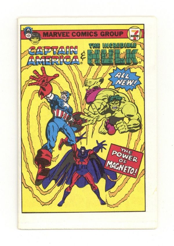 7-Eleven Captain America and the Incredible Hulk in "The Power of Magnito!" (1981) is a mini promotional comic distributed by 7-Eleven. 24-page, 3" x 4-1/2" full-color mini-comic published by Seven Eleven, 7-Eleven, 7 Eleven in 1981. Comic story plus kid's puzzle pages, etc. Note: This comic is not bound and stapled in the conventional mode, but rather comes as a 24-page fold out. Grade: NM- 9.2 explanation of grade Condition: Used (collectible)
