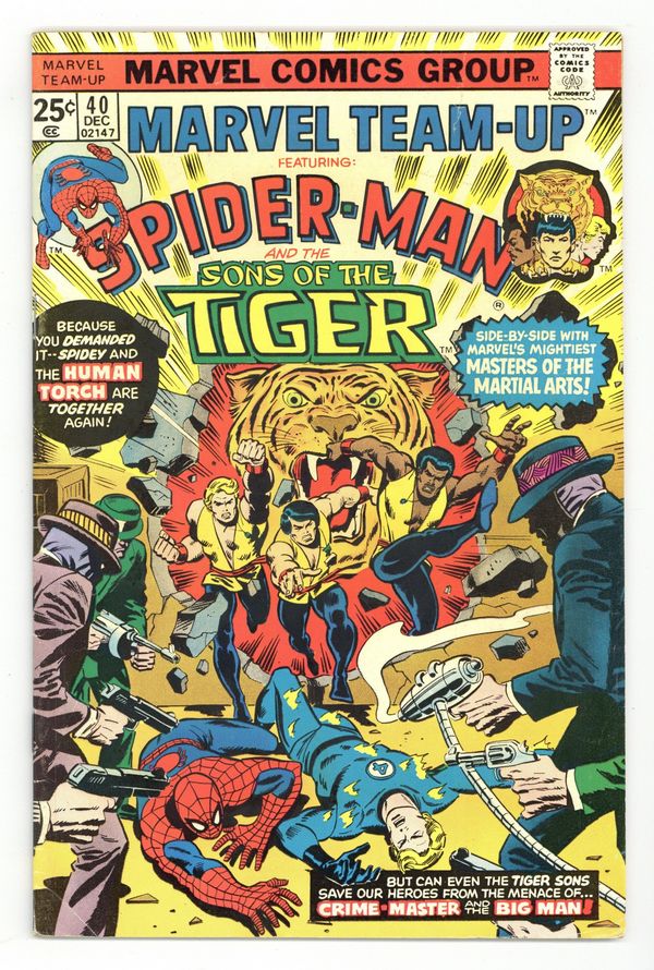 Mark Jeweler Advertisement Insert Variant. "Murder's Better The Second Time Around!" Part 2 of 2. Guest-starring Spider-Man, the Human Torch, and the Sons of the Tiger (1st full-color appearance). Script by Bill Mantlo. Pencils by Sal Buscema. Inks by Mike Esposito and Dave Hunt. Cover by Sal Buscema and Mike Esposito. It's a wild free-for-all in an abandoned warehouse as Spider-Man and the Human Torch duke it out with the Big Man, Crime Master, Sandman, and the Enforcers! However, the two heroes are badly outnumbered and go down to defeat! Fortunately though, a group of martial artists is training nearby and stumble across the captive torch and wall-crawler! Now the odds suddenly look better as the Sons of the Tiger join the fray! During the furious final battle, friendships will be formed, mysteries will be solved, and tragedy will strike! (Notes: The Sons of the Tiger appear next in Deadly Hands of Kung Fu 19. This issue contains a full-page ad for Hostess Fruit Pies featuring the Hulk vs. the Abomination and Wendigo.) 32 pages Cover price $0.25. Grade: VG/FN 5.0 explanation of grade Condition: Used (collectible)
