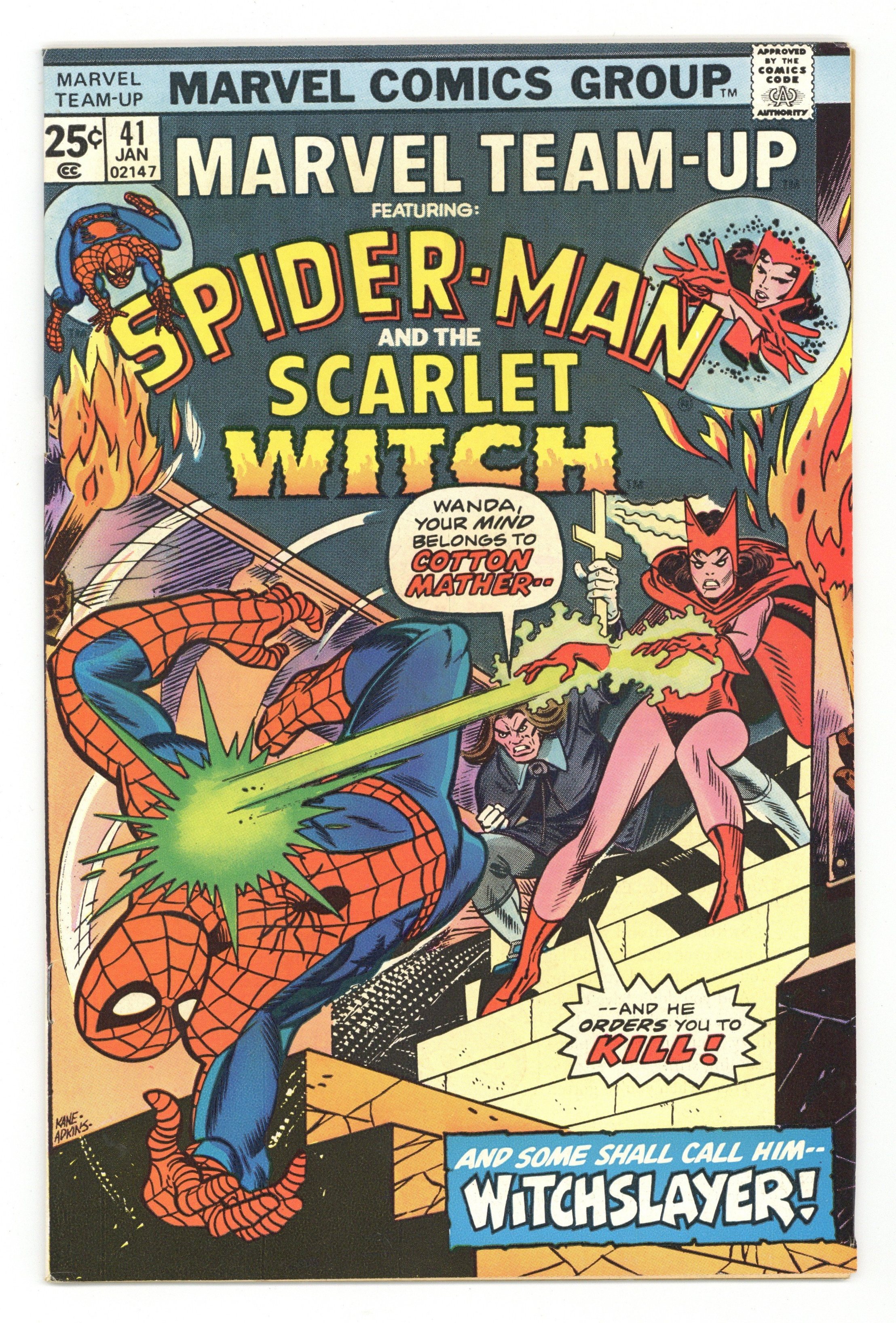 Mark Jeweler Advertisement Insert Variant. "A Witch in Time!" Part 1 of 4. Guest-starring Spider-Man and the Scarlet Witch. Script by Bill Mantlo. Pencils by Sal Buscema. Inks by Mike Esposito and Dave Hunt. Cover by Gil Kane and Dan Adkins. The Scarlet Witch is going back in time! To the one place any witch would never want to go...1692 Salem, Massachusetts! What has possessed Wanda to travel to an abandoned castle in Latveria and rendezvous with Doctor Doom's time machine and a deranged 17th century preacher? The Scarlet Witch knows she's in trouble against Cotton Mather and sends a desperate plea for help back to New York. Who will answer her plea? The Amazing Spider-Man! Can the web-slinger save Wanda from a horrible fate...or will the Salem Witch Trials claim another victim? Cameo appearance by the Vision. (Note: The letters page contains Marvel Value Stamp series B #14 Spider-Man.) 32 pages Cover price $0.25. Grade: FN- 5.5 explanation of grade Condition: Used (collectible)