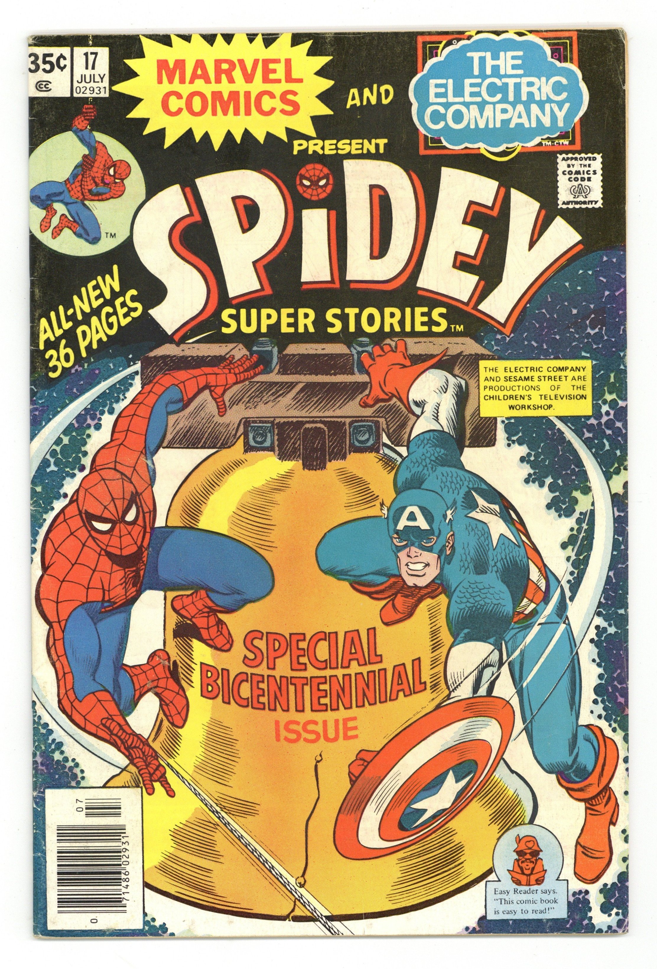 Mark Jeweler Advertisement Insert Variant. Doctor Doom. Special Bicentennial Issue. "A Bicentennial Adventure with Captain America!" Guest-starring Captain America. Doctor Strange, Ice Man, Falcon, Medusa & Lockjaw of the Inhumans, Hulk, and Thor cameos. Story by Jim Salicrup. Art by Winslow Mortimer, Mike Esposito, and Tony Mortellaro. Cover by John Romita, Sr. Can Spidey and the Sentinel of Liberty prevent Kang the Conqueror from altering the course of US history. Includes the 1-page feature "Captain America." Includes the back-up tale "Spidey meets the Stomper!" By Pat Thackray based on the Electric Company script by Thad Mumford. Also includes a pin-up featuring Spider-Man and Captain America at the signing of the Declaration of Independence. Featuring the clip and collect Spidey Stamp: #1 Spidey. Cover price $0.35. Grade: FN- 5.5 explanation of grade Condition: Used (collectible)