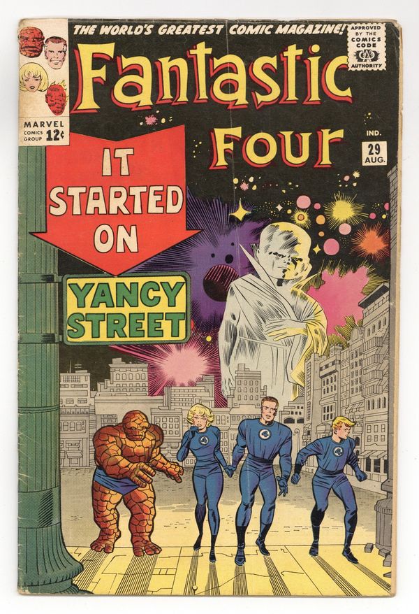 Cover pencils by Jack Kirby, inks by Chic Stone. It Started on Yancy Street!, script by Stan Lee, pencils by Jack Kirby, inks by Chic Stone; the FF run from the jeers and pranks of the Yancy Street Gang; the FF battles the Red Ghost; the Super Apes take off in FFs ship, leaving them abandoned; the Watcher returns them home. Cameos by the Puppet Master, the Mole Man, the Super-Skrull, the Miracle Man, Doctor Doom, the Sub-Mariner, and the Mad Thinker. 36 pgs. $0.12. Cover price $0.12. Grade: GD+ 2.5 explanation of grade Condition: Used (collectible)