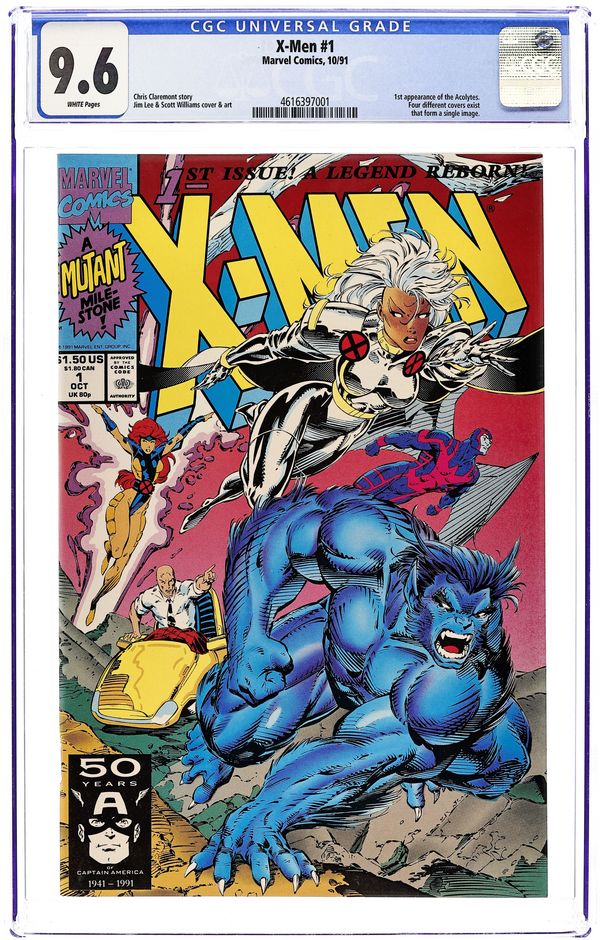 Direct Edition. Beast/Storm double cover. Cover pencils by Jim Lee (signed), inks by Scott Williams. Rubicon, script by Jim Lee (Co-Plot) and Chris Claremont, pencils by Jim Lee, inks by Scott Williams; Magneto forms the Acolytes and proclaims Asteroid M a haven for mutants everywhere; But the rest of the world doesn't see it that way; Nick Fury cameo. 2-page pin-up: gallery of X-Men villains. X-Men Sketchbook by Jim Lee. Cover price $1.50. NOTE: Cover A connects to covers 1B, 1C, and 1D to form a single giant image. Cover price $1.50. Grade: CGC 9.6 explanation of grade Condition: Used (collectible)