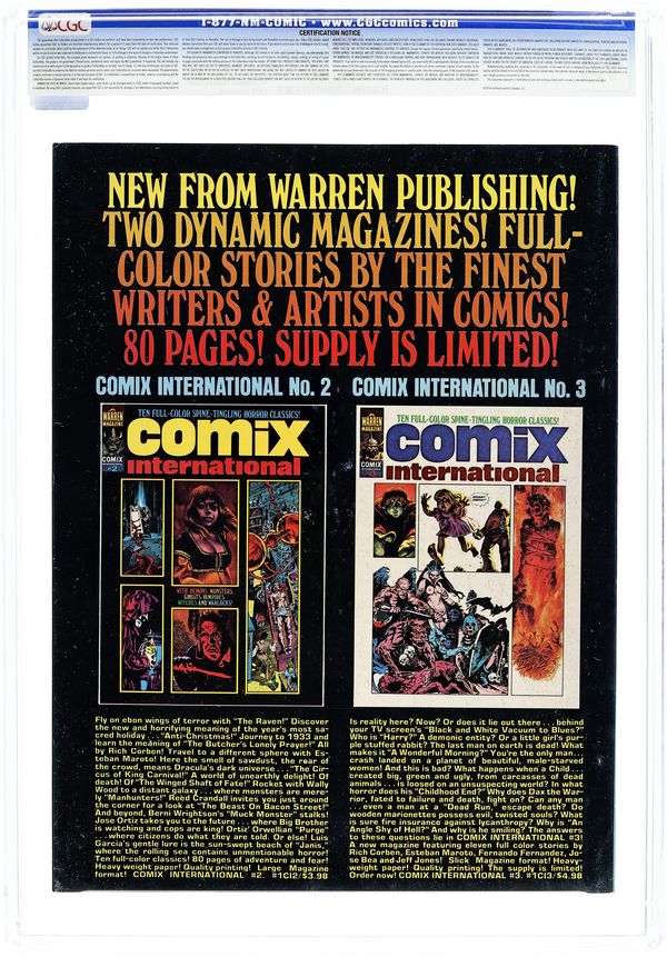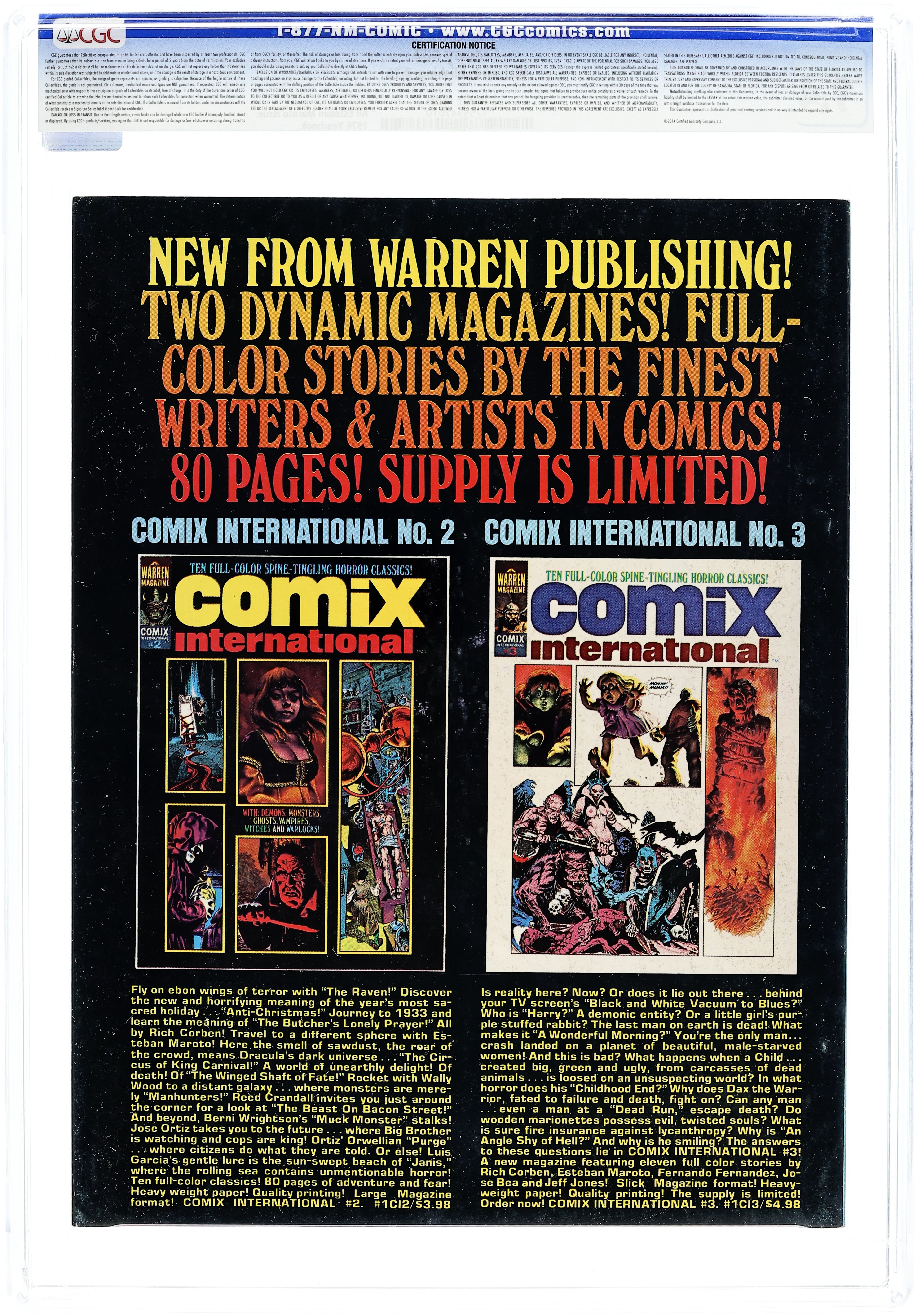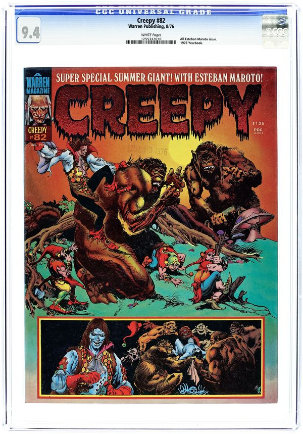 Stories in this 1976 Creepy Annual include: Forgive us our Debts by Jim Stenstrum and Esteban Maroto; A Most Private Terror by Budd Lewis and Esteban Maroto; Relatives! by Bruce Bezaire and Esteban Maroto; and A Scream in the Forest by Greg Potter and Esteban Maroto. Cover art is a montage of interior panels. Cover price $1.25. Grade: CGC 9.4 explanation of grade Condition: Used (collectible)