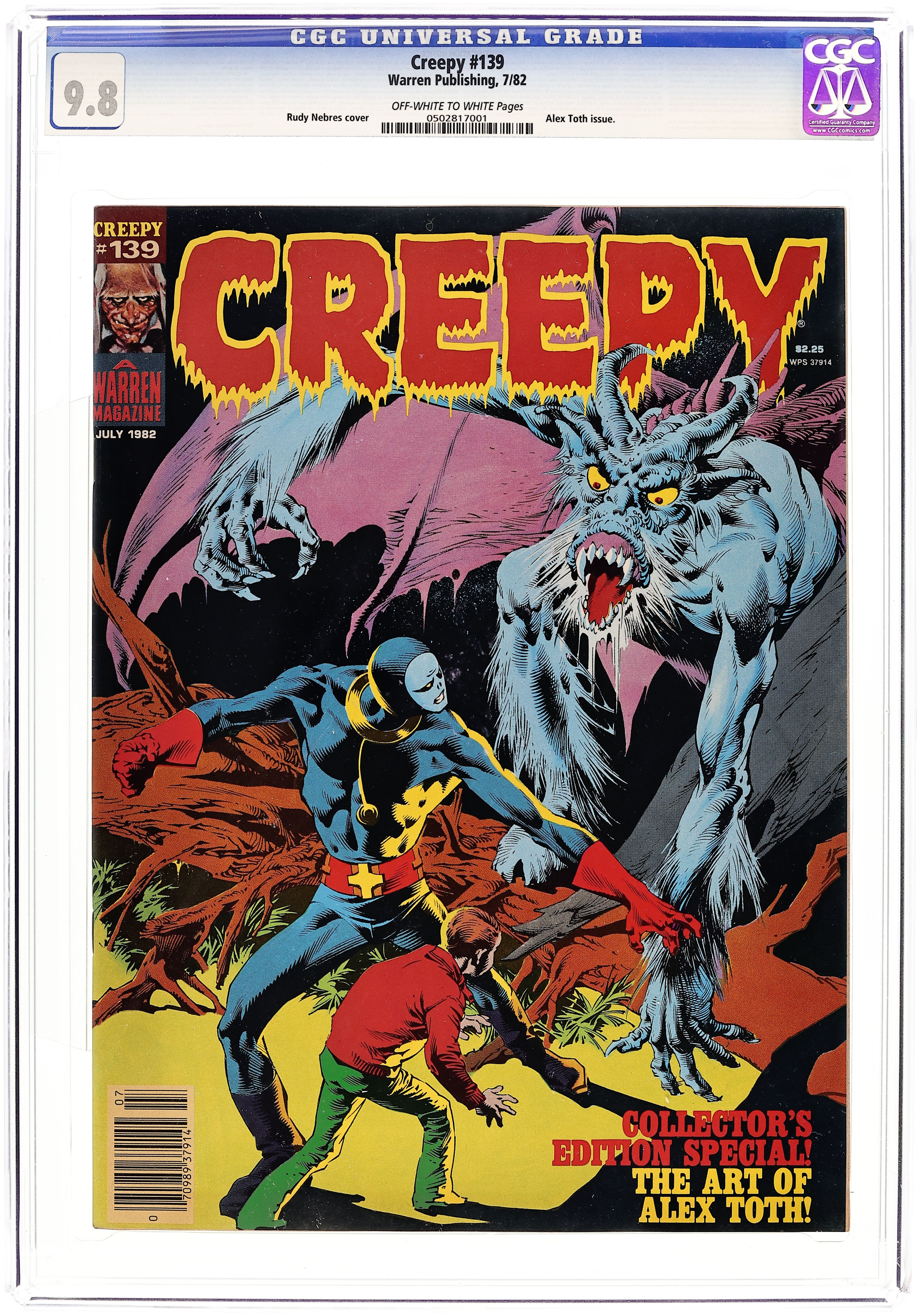 This special Alex Toth issue includes the following reprinted stories: Daddy and the Pie by Bill DuBay and Alex Toth; The Monument by Archie Goodwin and Alex Toth; Grave Undertaking by Archie Goodwin and Alex Toth; Rude Awakening! by Archie Goodwin and Alex Toth; Survival! by Archie Goodwin and Alex Toth; Phantom of Pleasure Island by Gerry Boudreau and Alex Toth; and Unreal! by Alex Toth. Cover art by Rudy Nebres. Cover price $2.25. Grade: CGC 9.8 explanation of grade Condition: Used (collectible)