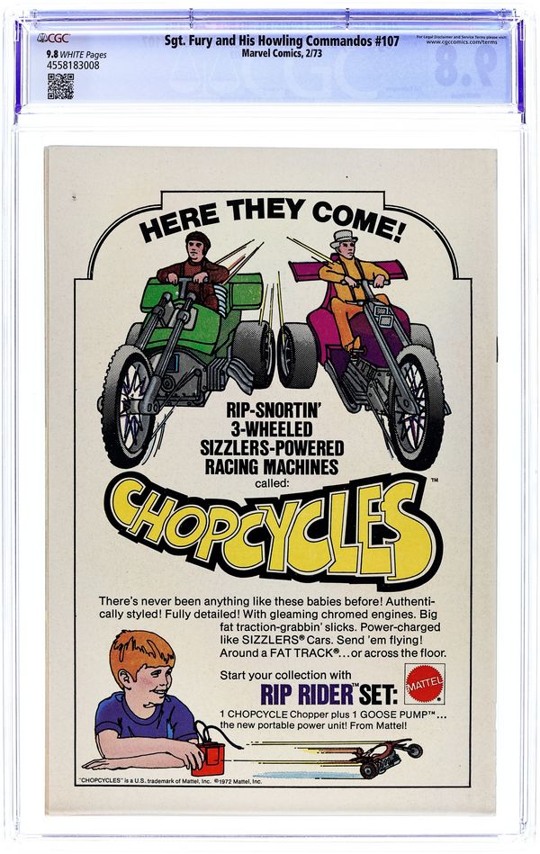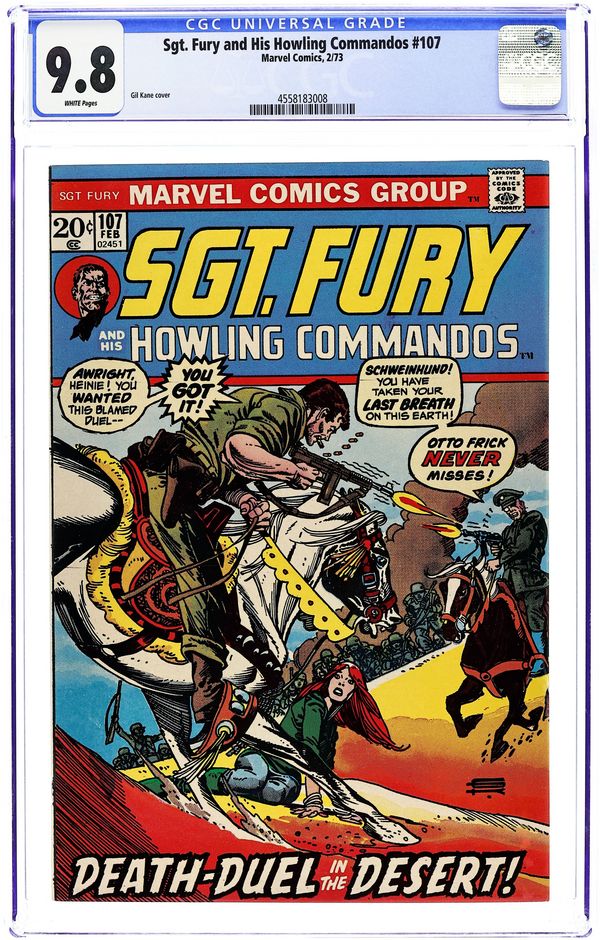 Reprint story from issue #37, with a new cover. In the Desert...to Die! - Written by Roy Thomas. Art by Dick Ayers and John Tartaglione. Cover by Gil Kane. The Howlers parachute into Saharan North Africa to try to stop the rampage of a nomadic tribe, whose leader, the Desert Hawk, works to aid the Nazi cause. Characters in this issue: Sergeant Nick Fury; Eric Koenig; Percival Pinkerton; Rebel Ralston; Gabe Jones; Dum Dum Dugan; Izzy Cohen; Desert Hawk [Ben Ali Mussim]; Sheila Mussim; Colonel Otto Frick. 32 pages, full color. Cover price $0.20. Grade: CGC 9.8 explanation of grade Condition: Used (collectible)