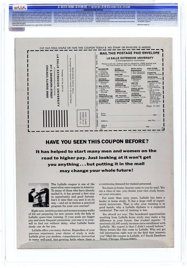 Simon Garth dies but is brought back to life as a zombie and doomed to walk the earth as one of the living dead. In "Voodoo Island" and "Night of the Spider," Garth's daughter travels to an island hoping to solve the mystery of his disappearance and her father, as the zombie, follows. Script by Steve Gerber and art by Pablo Marcos. Issue also has "Voodoo Unto Others" (Script by Tony Isabella and art by Winslow Mortimer), "Acid Test" (Script by Stan Lee and art by George Tuska), an article about Brother Voodoo ("Marvel's most mysterious superhero"), "Twin Burial" (Script by Chuck Robinson and art by Ralph Reese), "From Out of the Grave" (Script by Stan Lee and art by Gene Colan), and an article about voodoo. All stories are in black and white. Cover price $0.75. Grade: CGC 9.6 explanation of grade Condition: Used (collectible)