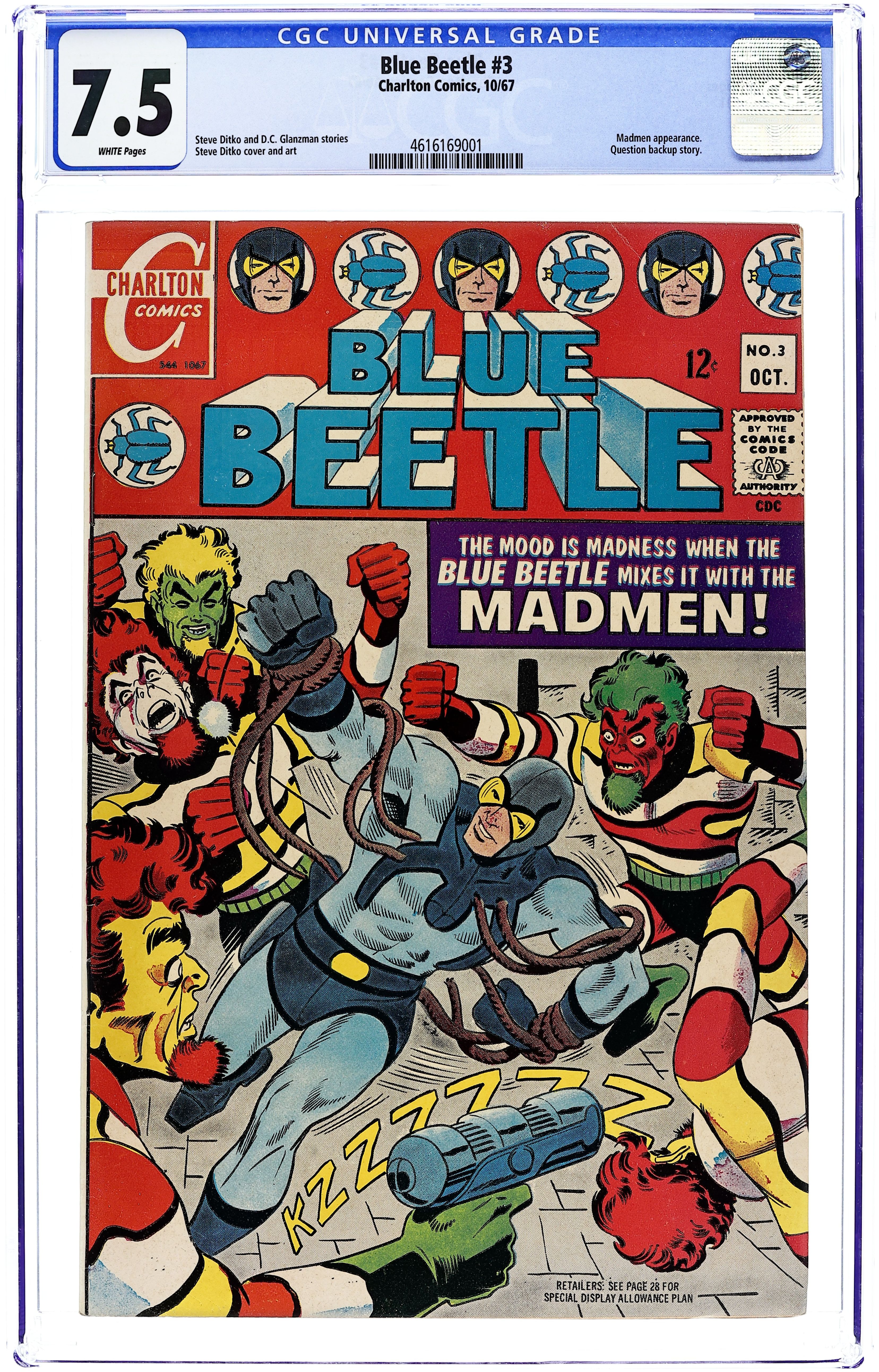 Ended Nov 10 2025 Bid History 13 bids Winning Bid $44 Cover by Steve Ditko. Stories and art by Steve Ditko, David Charles Glanzman and Dick Giordano. The third (or fourth, depending on how you count it) Charlton series to feature the Blue Beetle introduces the Silver Age BB, Ted Kord. The Blue Beetle battles the criminal gang known as the Madmen, whose fashion sense presages DC's The Creeper (another Ditko creation). The Question investigates a murder at a square construction. The Madmen; The Question. 32 pages, Full Color. Cover price $0.12. Grade: CGC 7.5 explanation of grade Condition: Used (collectible)