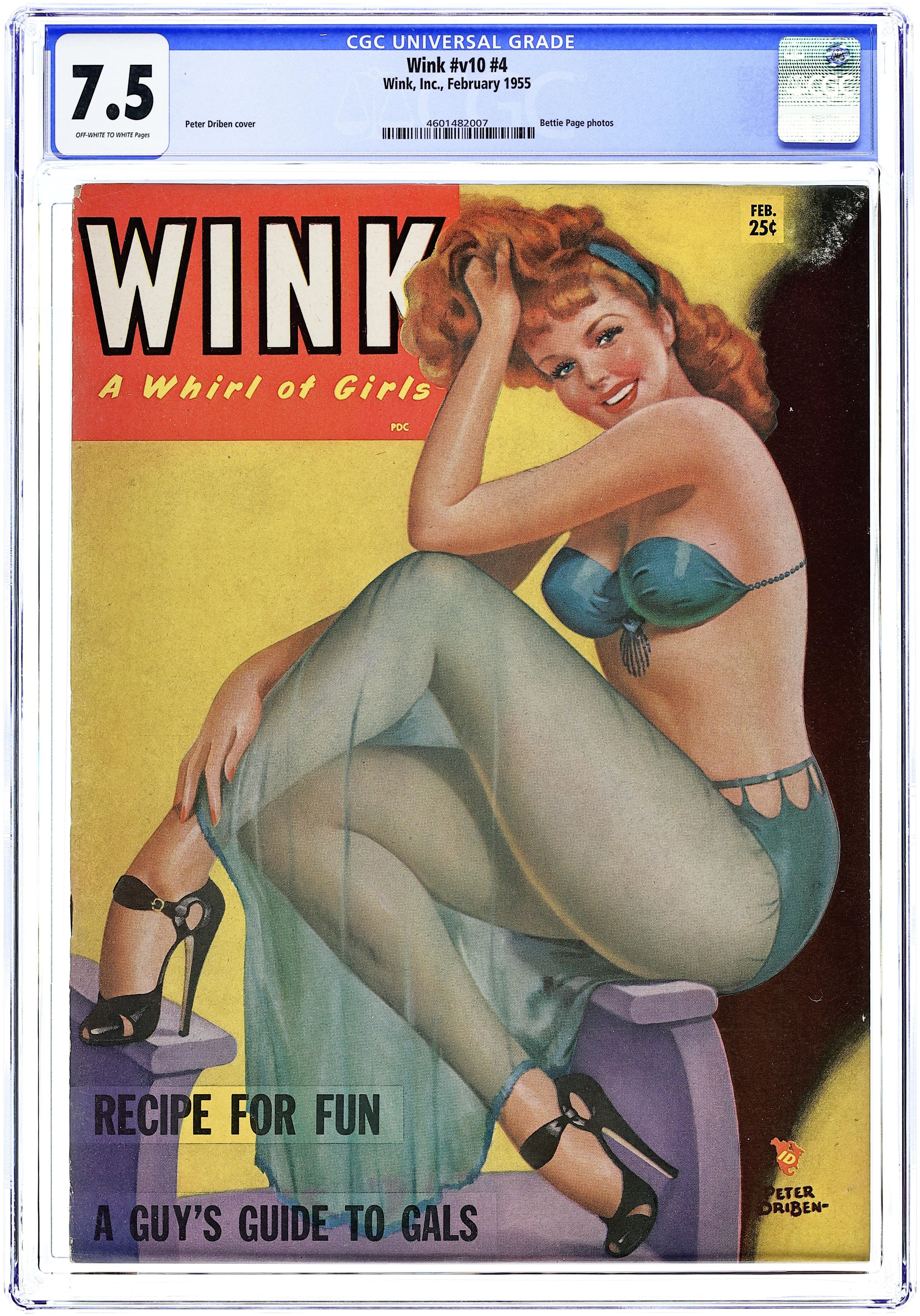 Volume 10, Issue 4 - February, 1955. Painted cover by Peter Driben. This issue features a two-page pictorial with Bettie Page, one full-page photo of her, and a full-page Irving Klaw ad with numerous photos of Bettie within. 8.5" x 11.5", 50 pages, B&W. -MATURE READERS- Cover price $0.25. Grade: CGC 7.5 explanation of grade Condition: Used (collectible)