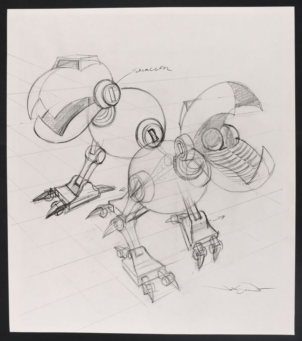 One of Baxter Stockman's most iconic inventions from the TMNT universe, this prelim of the small (but often troublesome!) robots was produced for Mondo first as a subscription poster and later for figure packaging. Signed by the artist. Pencil on paper. 12" x 13 3/4".