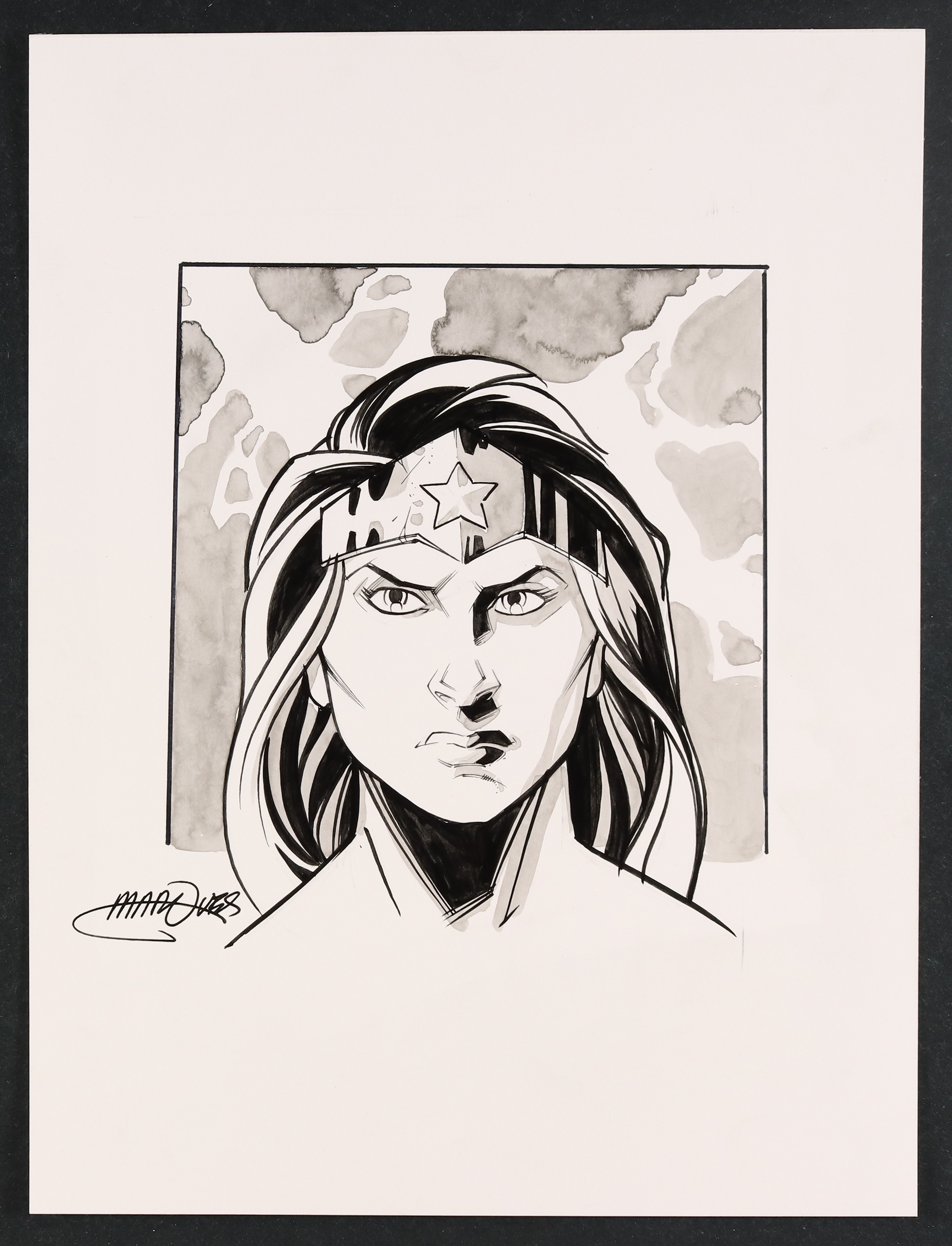 • Marques' bold linework blends beautifully with the greytones to give this head shot of the Amazon princess a great sense of texture. Signed by the artist. Pencil, ink, and inkwash on art board. 9" x 12".