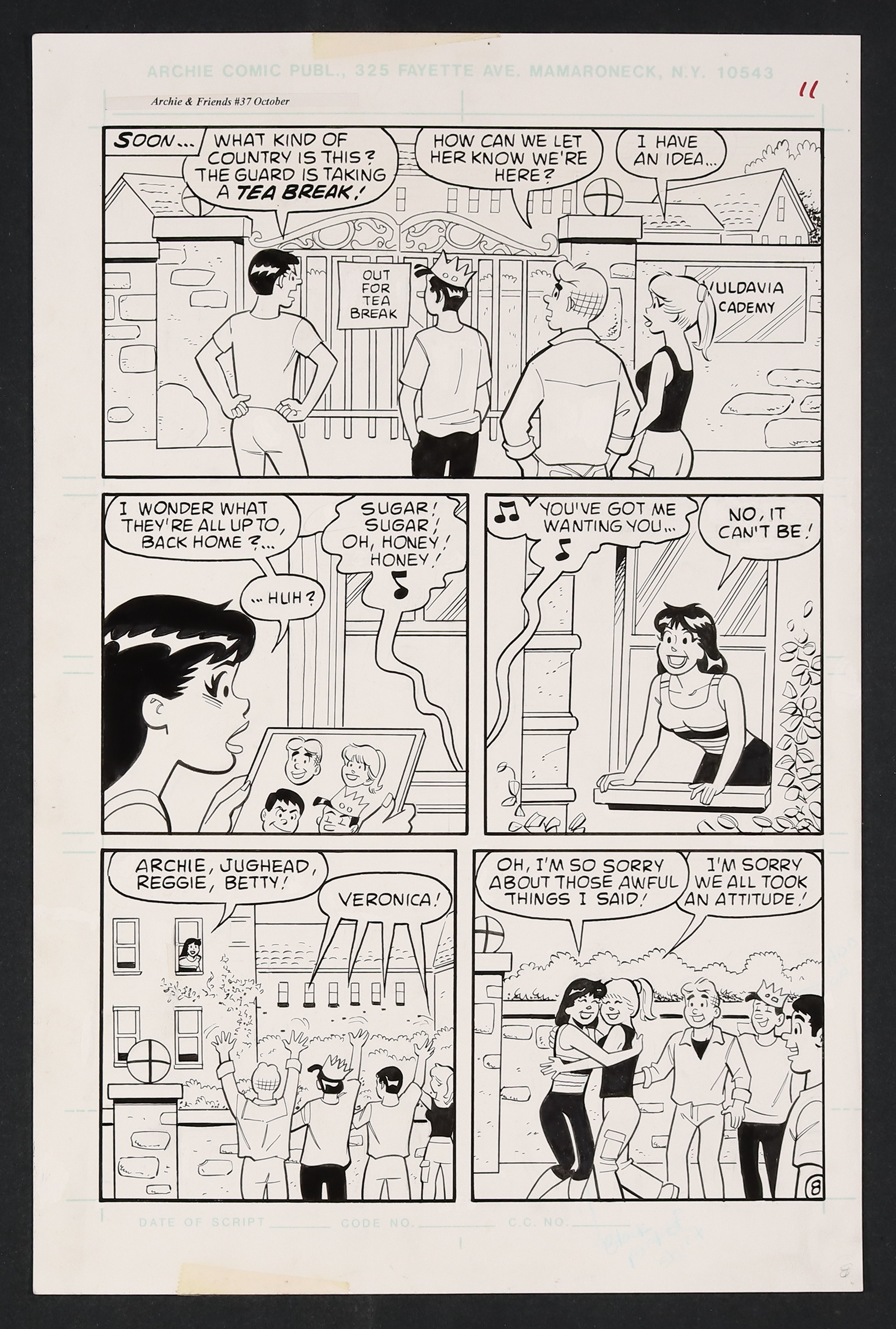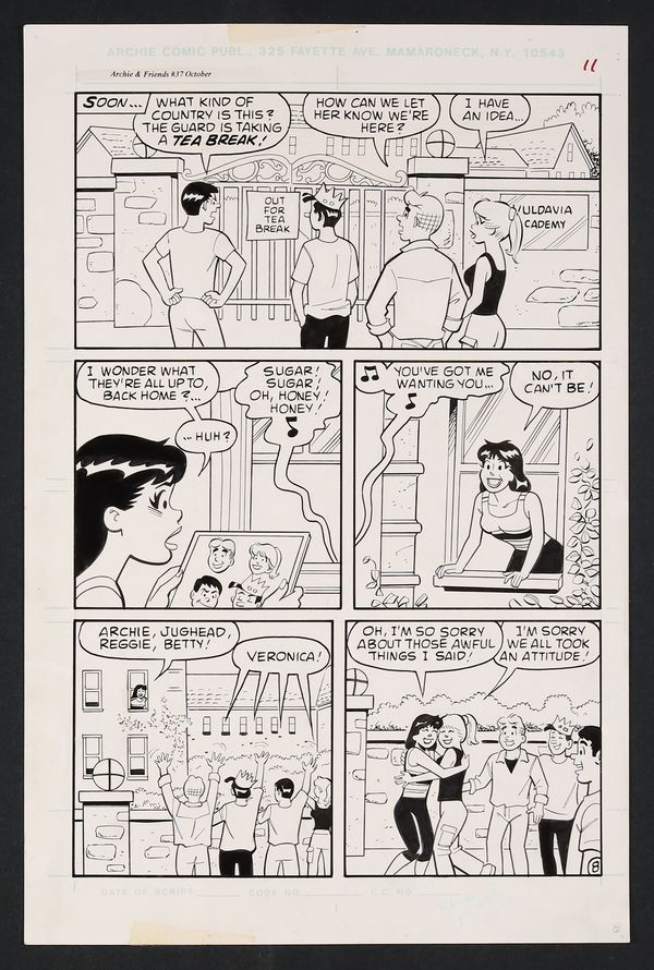 In the fictional European nation of Vuldavia where Veronica has run away to boarding school after a fight with the gang, her old pals have flown out to convince her to return in a way that only they could- by singing their smash hit single Sugar, Sugar! Pencil and ink on Archie Comics art board. 11 1/2" x 17 1/2".