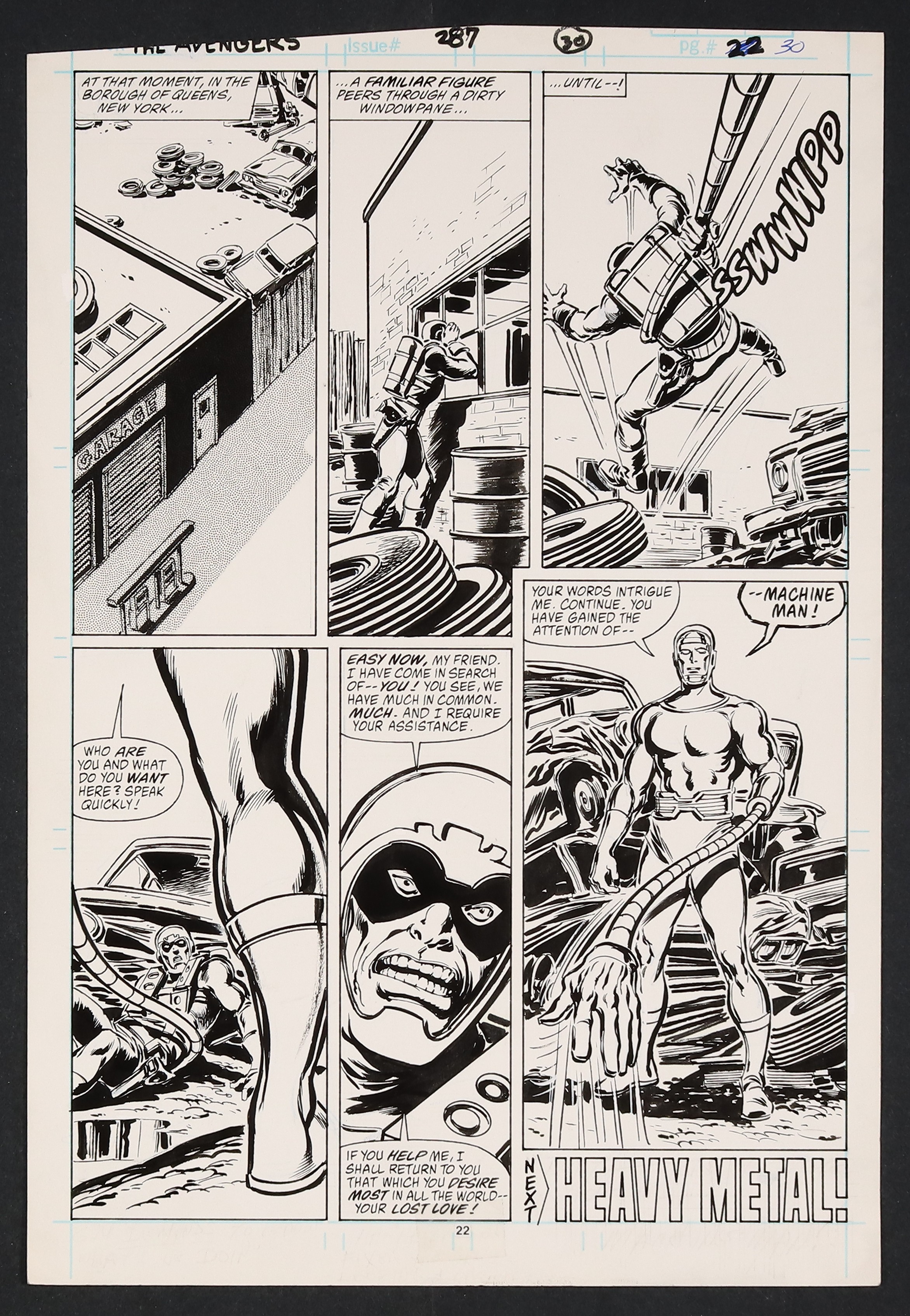 We see the Fixer (Super Adaptoid in disguise) as he seeks a somewhat surprising ally in Machine Man! With a tempting offer made, might we see these two robots team up and take down the Avengers? Pencil and ink on Marvel Comics art board. Pencil and ink on Marvel Comics art board. 11" X 16 1/4".
