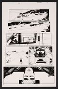 Booster Gold tests the limits of self driving cars! A well crafted, downright cinematic opening page with wide shots that slowly close in to reveal that Booster in a bad way, tied to the hood of a driverless car heading straight for a cliff edge!. Pencil and ink on Comics art board. 11" X 17".