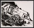 A big, bold double page spread title page opens this issue as Blue Beetle, in one of his many vehicles, races to catch up to the driverless van that his best friend Booster Gold is tied to the top of. Will Blue Beetle be able to stop the van or is this the end of tomorrow's greatest hero? Pencil and ink on two sheets of comic art board affixed with tape on the rear. 20 3/4" X 17"
