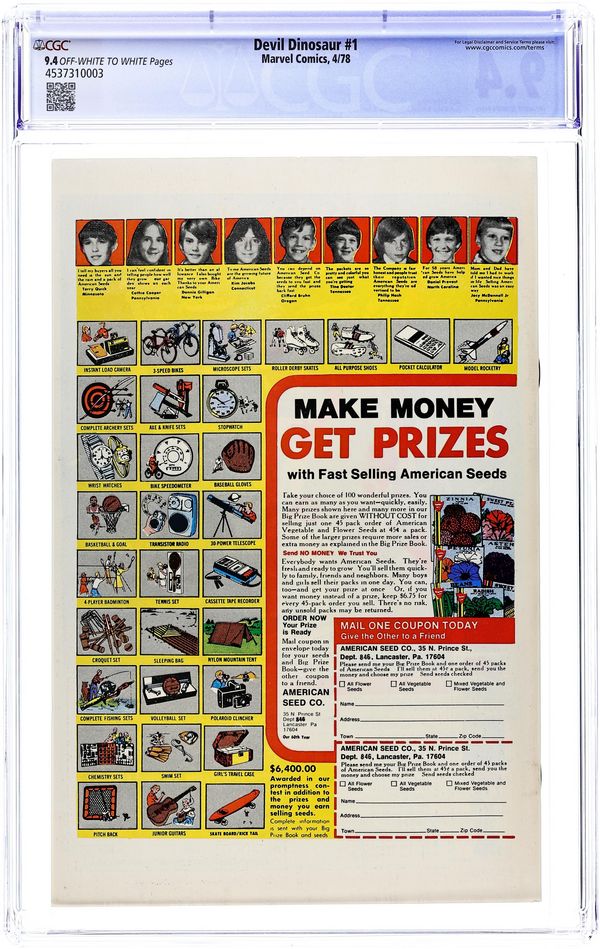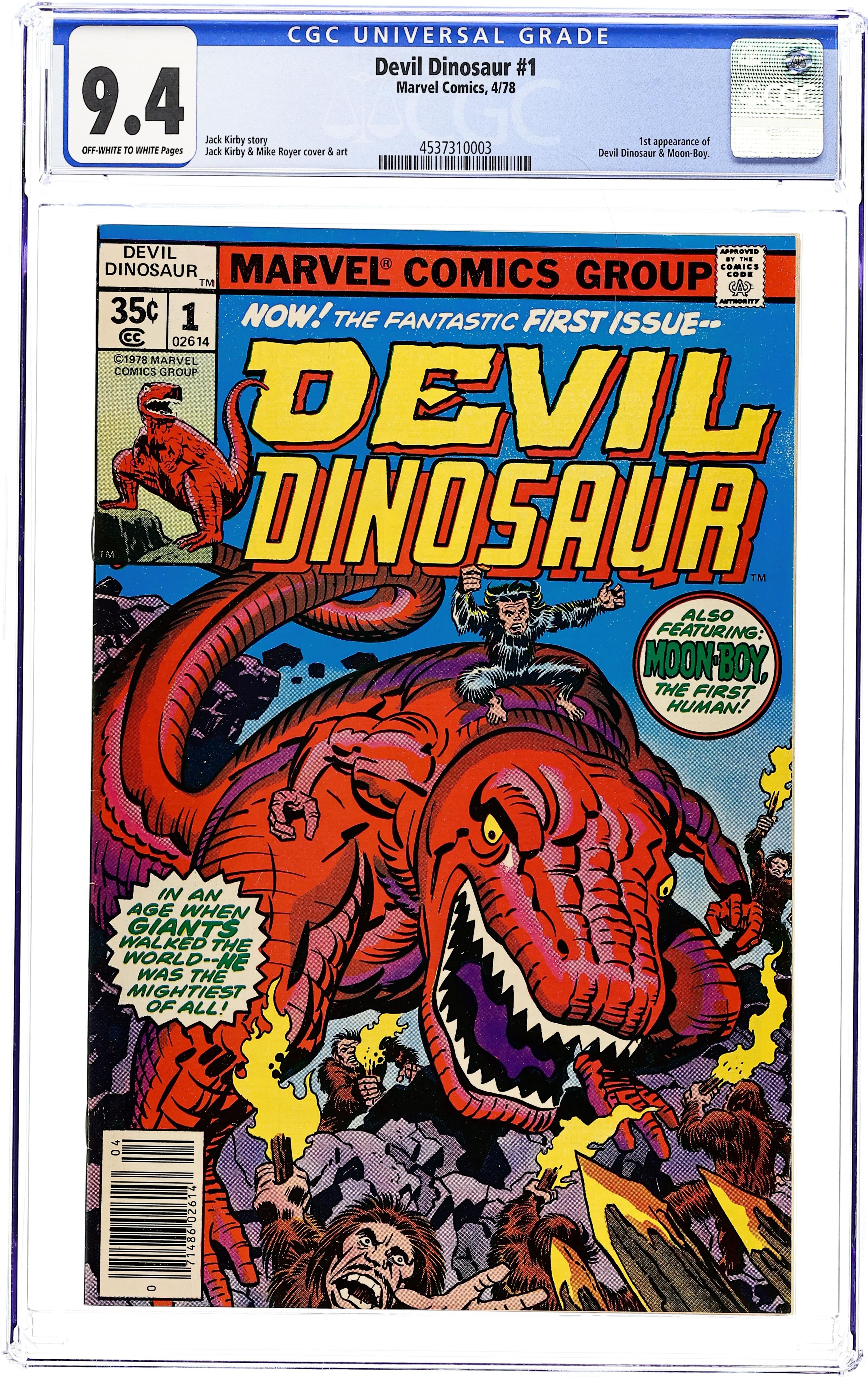 Cover pencils by Jack Kirby, inks by Frank Giacoia. Devil Dinosaur and Moon-Boy, script by Jack Kirby, pencils by Jack Kirby, inks by Mike Royer; Deep in the Valley of the Flame, Moon-Boy reveals the origins of Devil Dinosaur; Is the red-skinned and red-eyed Dino as menacing as the town-folk believe? 36 pgs., full color. $0.35. Cover price $0.35. Grade: CGC 9.4 explanation of grade Condition: Used (collectible)