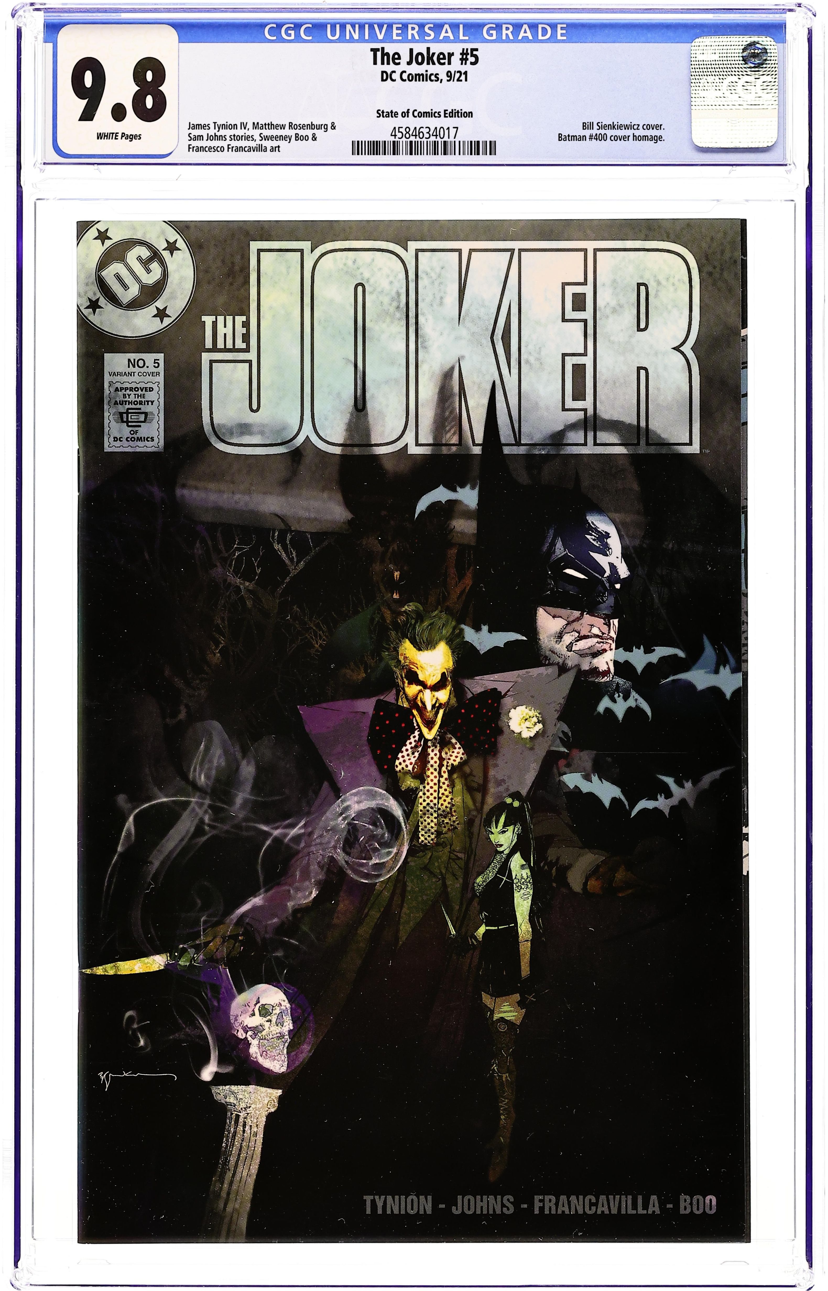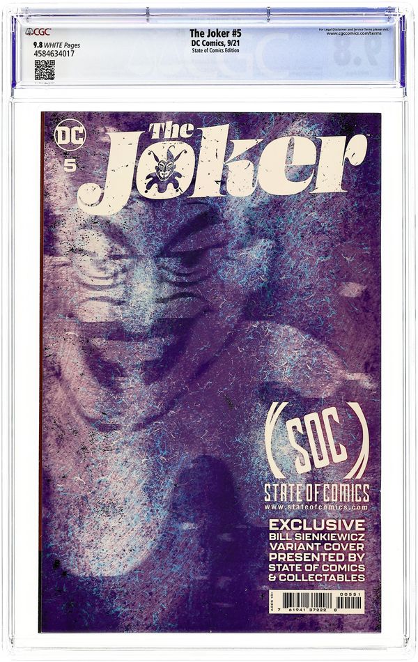 State of Comics Exclusive Variant Cover by Bill Sienkiewicz. Written by James Tynion IV, Matthew Rosenberg & Sam Johns. Art by Francesco Francavilla & Sweeney Boo. The never-before-seen tale of The Jokers first night in Arkham Asylum is finally revealed! When a lunatic in a clown suit tries to poison Gotham Citys reservoir and is placed in Arkham Asylum before his trial, Detective Jim Gordon realizes somethings different about this new inmate that could forever change the future of Gotham. Backup: Rising-star artist Sweeney Boo joins the series as things get worse and worse for Punchline and Bluebird. Punchlines prison war against the Queen of Spades escalates, and no prisoner at Blackgate Penitentiary will be exempt from choosing sides. And after barely escaping death at the hands of Punchlines former accomplice, will Bluebird have the will to continue her investigation and find the mysterious woman from Punchlines past who has the answers shes looking for? 40 pages, full color. Rated T+ Grade: CGC 9.8 explanation of grade Condition: Used (collectible)