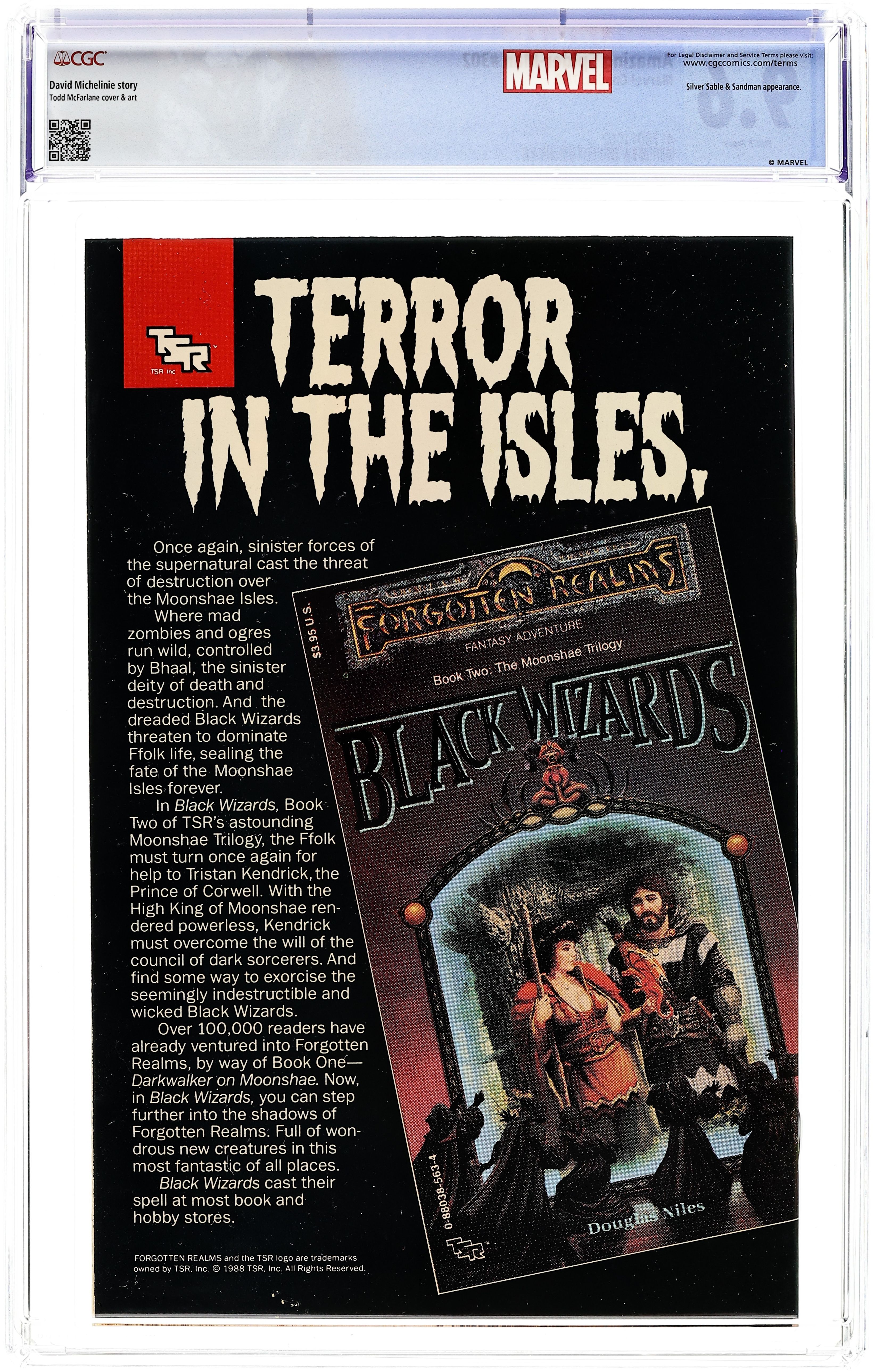 Direct Edition. "(Mid) American Gothic!" Script by David Michelinie. Art by Todd McFarlane. Cover by Todd McFarlane. Peter Parker receives a job offer from a high tech company in Kansas! So, Spider-Man's alter-ego travels to America's heartland to tour the company's facilities! But upon arrival Peter discovers that there's something rotten in the sunflower state! Good thing the web-slinger made the trip too! Cameo appearances by Mary Jane Watson, Silver Sable, and the Sandman. (Note: This issue includes a full-page ad for the Evolutionary War saga that ran through Marvel's 1988 annuals.) 36 pgs. Cover price $1.00. Grade: CGC 9.6 explanation of grade Condition: Used (collectible)