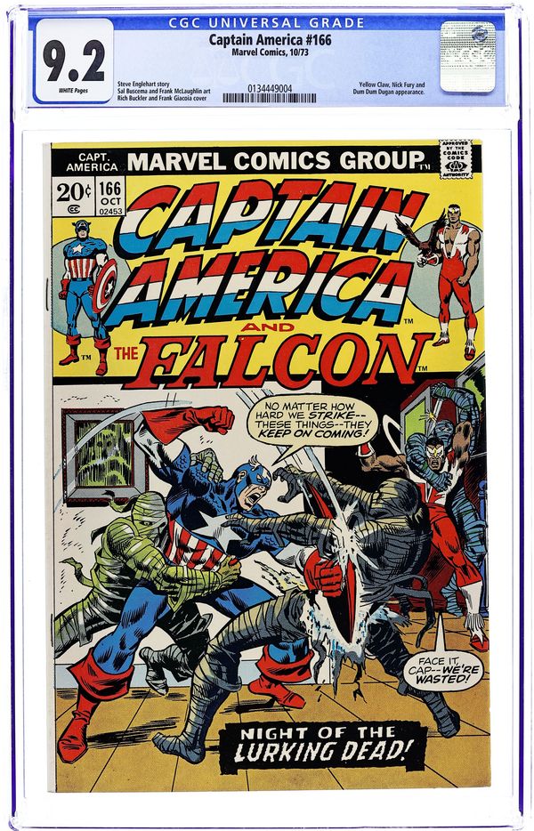 Ended Sep 15 2025 Bid History 5 bids Winning Bid $37 "Night of the Lurking Dead!" Part 2 of 3. Script by Steve Englehart. Pencils by Sal Buscema. Inks by Frank McLaughlin. Cover by Rich Buckler and Frank Giacoia. In a dastardly twist, the Yellow Claw tricked Captain America into fighting Nick Fury last issue. The star-spangled avenger won the fight in the claw's underground lair, but the Director of SHIELD was badly injured. As a result Cap rushes Nick to a medical facility, and then travels to Harlem to find the Falcon. While Steve Rogers and Sam Wilson are talking, they hear a news report that Yellow Claw has been spotted near the Museum of Natural History. The shield-slinger and his partner sneak inside the museum and suddenly encounter mummies -- the living dead! And it's allpart of Yellow Claw's plan to raise Suwan, his grandniece, from the dead! Cameo appearances by Dum Dum Dugan, Contessa Valentina Allegra de la Fontaine, Sharon Carter, Peggy Carter, and Leila Taylor. 36 pages. Cover price $0.20. Grade: CGC 9.2 explanation of grade Condition: Used (collectible)