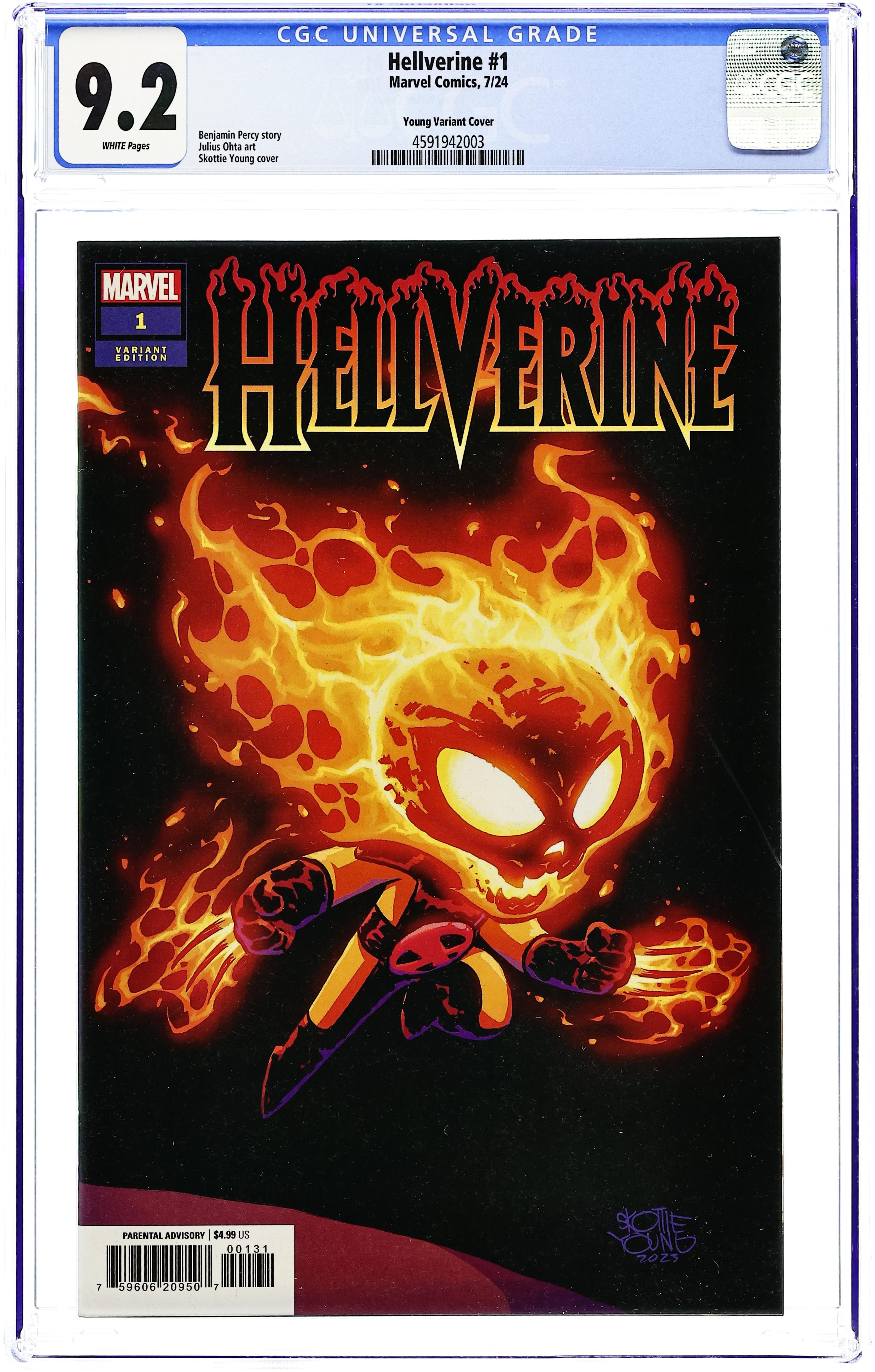 Ended Sep 29 2025 Bid History 6 bids Winning Bid $19 Written by Benjamin Percy. Art by Julius Ohta. Cover by Skottie Young. RIDE TO HELL AND BACK IN HELLVERINE'S FIRST EVER SOLO SERIES! Because you demanded it - the return of the HELLVERINE! When a DEMONIC FORCE known as BAGRA-GHUL first came to earth, it brought LOGAN and GHOST RIDER together to hunt it before it possessed WOLVERINE. But now, in the present day, what event will put the Hellverine back on the streets…and is he slashing his hellfire claws for good or evil? And, introducing the ALL-NEW HELLFIRE WARRIORS! 36 pages, full color. Rated Parental Advisory Cover price $4.99. Grade: CGC 9.2 explanation of grade Condition: Used (collectible) unless item is a new release