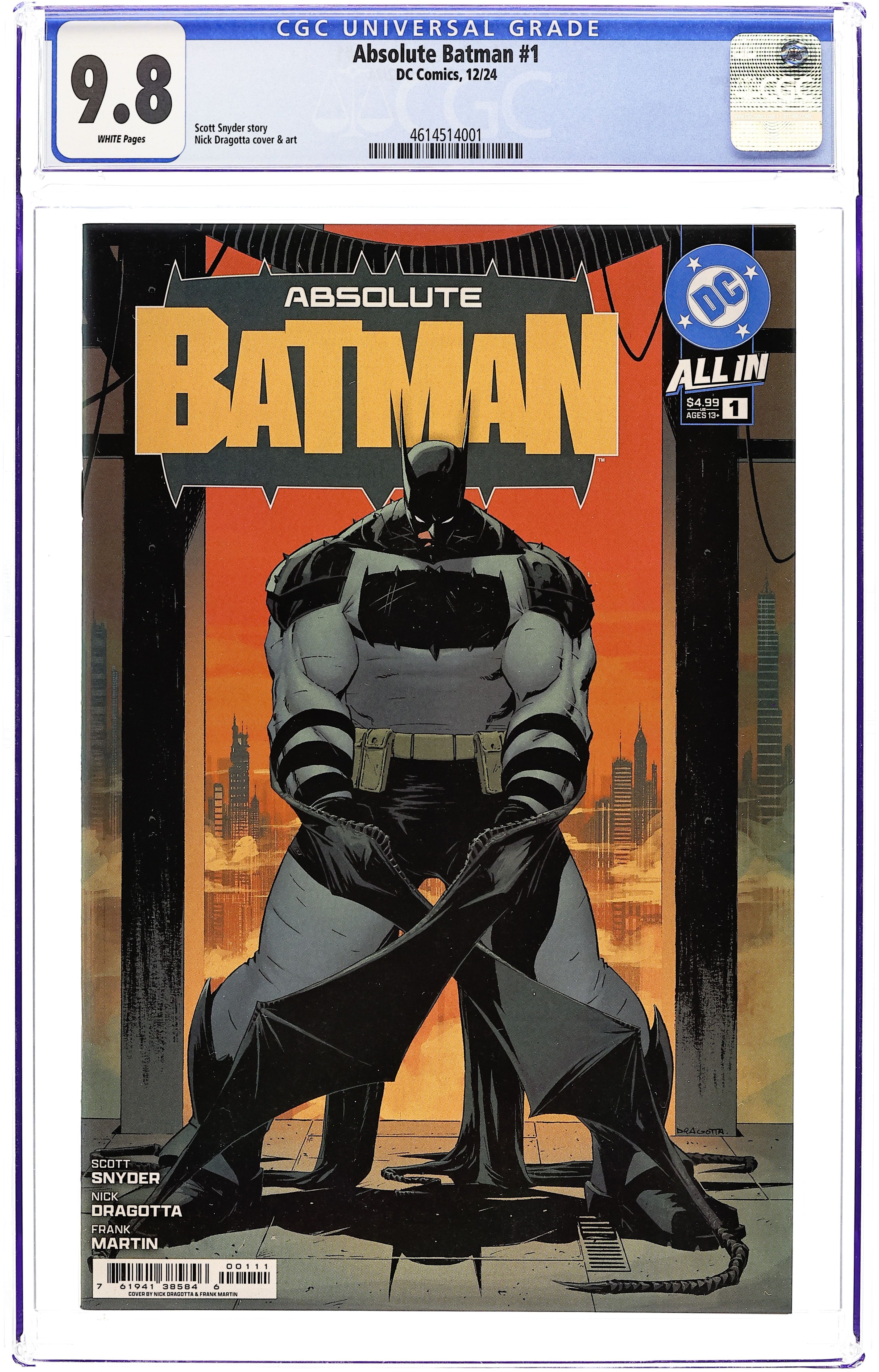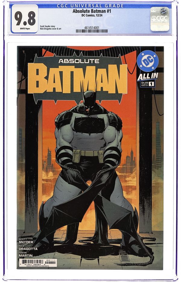 Ended Oct 17 2025 Bid History 24 bids Winning Bid $190 Written by Scott Snyder. Art by Nick Dragotta. Cover by Nick Dragotta. BATMAN LEGEND SCOTT SNYDER AND ICONIC ARTIST NICK DRAGOTTA TRANSFORM THE DARK KNIGHT'S TALE FOR THE MODERN AGE! Without the mansion...without the money...without the butler...what's left is the Absolute Dark Knight! 44 pages, full color. Rated T+ Cover price $4.99. Grade: CGC 9.8 explanation of grade Condition: Used (collectible)