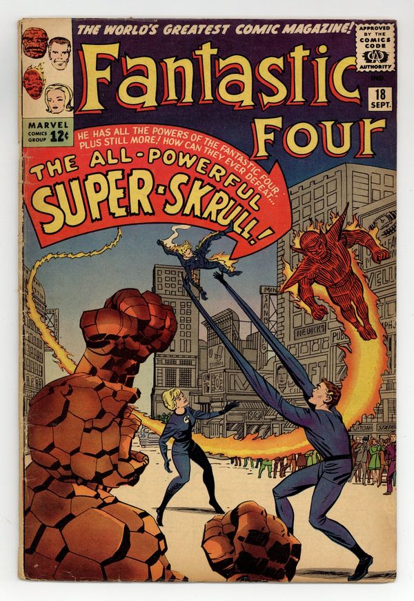 Cover pencils by Jack Kirby, inks by Paul Reinman. Origin and first appearance of the Super Skrull in "A Skrull Walks Among Us!", script by Stan Lee, pencils by Jack Kirby, inks by Dick Ayers; The Skrull Emperor sends the Super-Skrull, a Skrull possessing all the powers of the Fantastic Four, to conquer Earth. In answer to a question from Paul B. Weinstein about who originated the corner cover symbol box, Stan Lee replied: "Steve Ditko dreamed up the idea, and we're sure glad he did!" 36 pgs. $0.12. Cover price $0.12. Grade: GD/VG 3.0 explanation of grade Condition: Used (collectible)