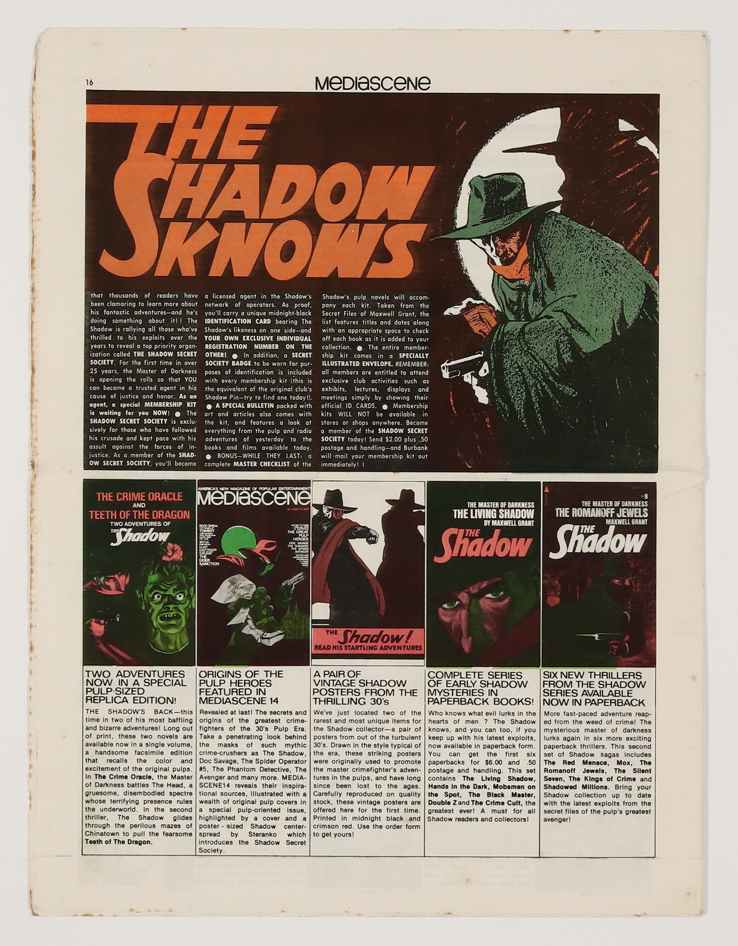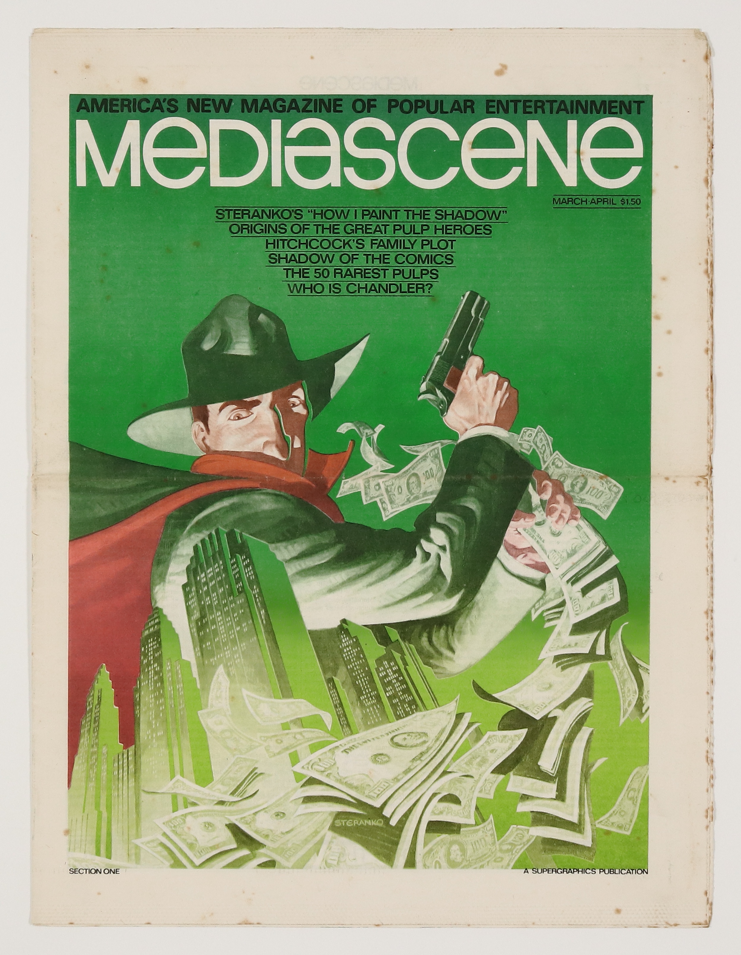 March-April 1976. Jim Steranko's fine zine covering popular entertainment. Tabloid newspaper format (all issues come folded) but on good quality white paper stock. This issue: Origin's of the Great Pulp Heroes, How Steranko paints the Shadow, the 50 rarest pulps, Alfred Hitchcock, plus more comics, book, and film news. Full color centerspread and cover by Steranko. 36 pages in two sections; partial color. Cover price $1.50. Grade: FN- 5.5 explanation of grade Condition: Used (collectible)