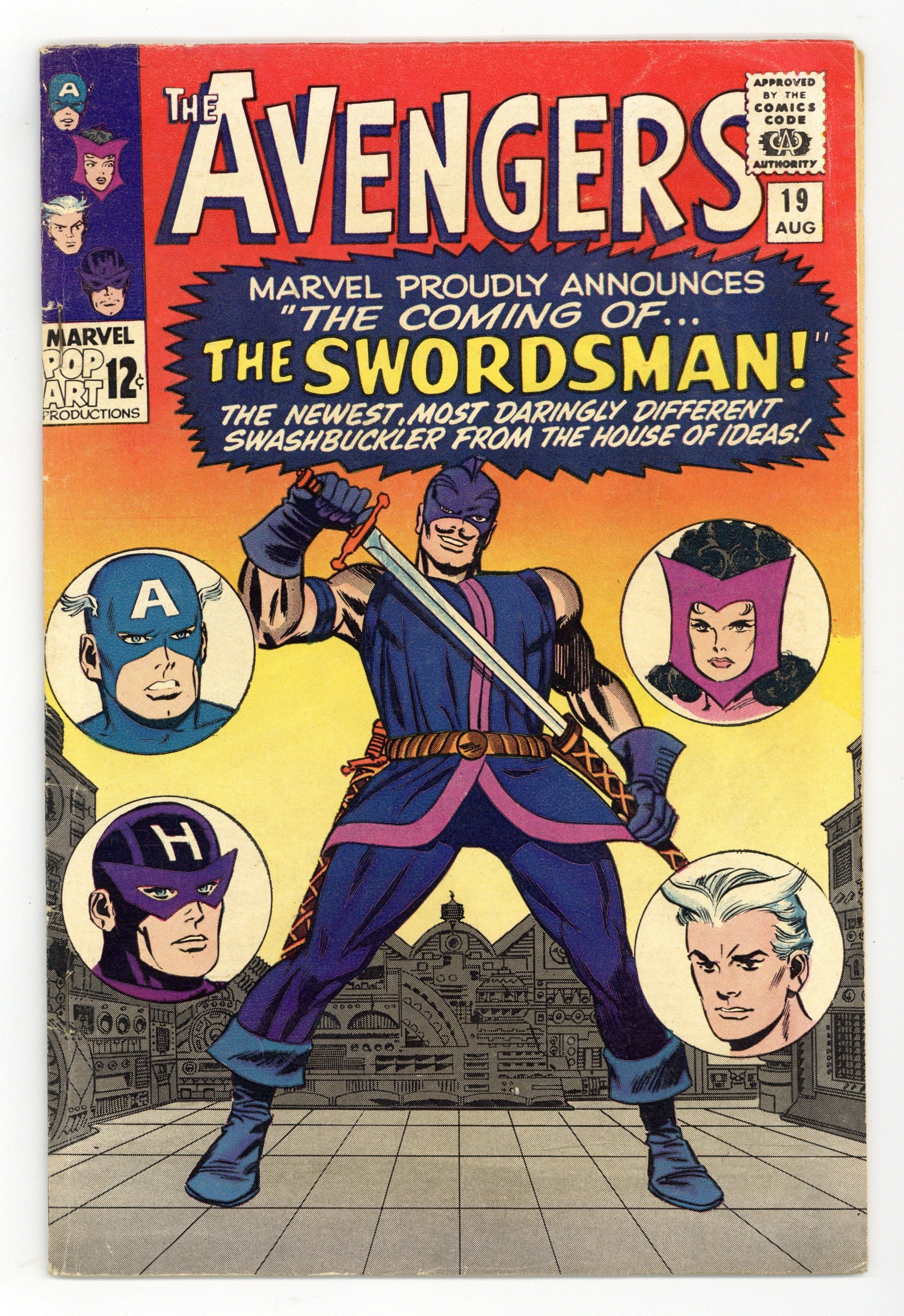 Cover pencils by Jack Kirby and Don Heck (insets), inks by Frank Giacoia. First appearance of the Swordsman and the origin of Hawkeye in "The Coming of... the Swordsman!", script by Stan Lee, pencils by Don Heck, inks by Dick Ayers; The Swordsman infiltrates the Avenger's base and Scarlet Witch and Quicksilver attack him; He then admits he was testing them and wants to apply for membership; Captain America intervenes with information saying he is a wanted man and the Swordsman escapes; Hawkeye explains that the Swordsman used to be his tutor when he was in the circus; Meanwhile, in Nick Fury's office in Washington D.C HYDRA agents find a letter from Captain America; They later discard it as trash; It explained how Captain America wanted to work for S.H.I.E.L.D.; A mobster finds it and gives it to the Swordsman; A trap is laid for Captain America; He then leaves to meet with "Nick Fury"; Hawkeye finds out about the plan and gathers the other Avengers to help him; Captain America battles the Swordsman and gets captured before the others can arrive to help. Avengers Roll Call: Captain America, Hawkeye, Quicksilver, and the Scarlet Witch. Letter to the editor from Cary Burkett. 36 pgs., full color. $0.12. Cover price $0.12. Grade: GD/VG 3.0 explanation of grade Condition: Used (collectible)