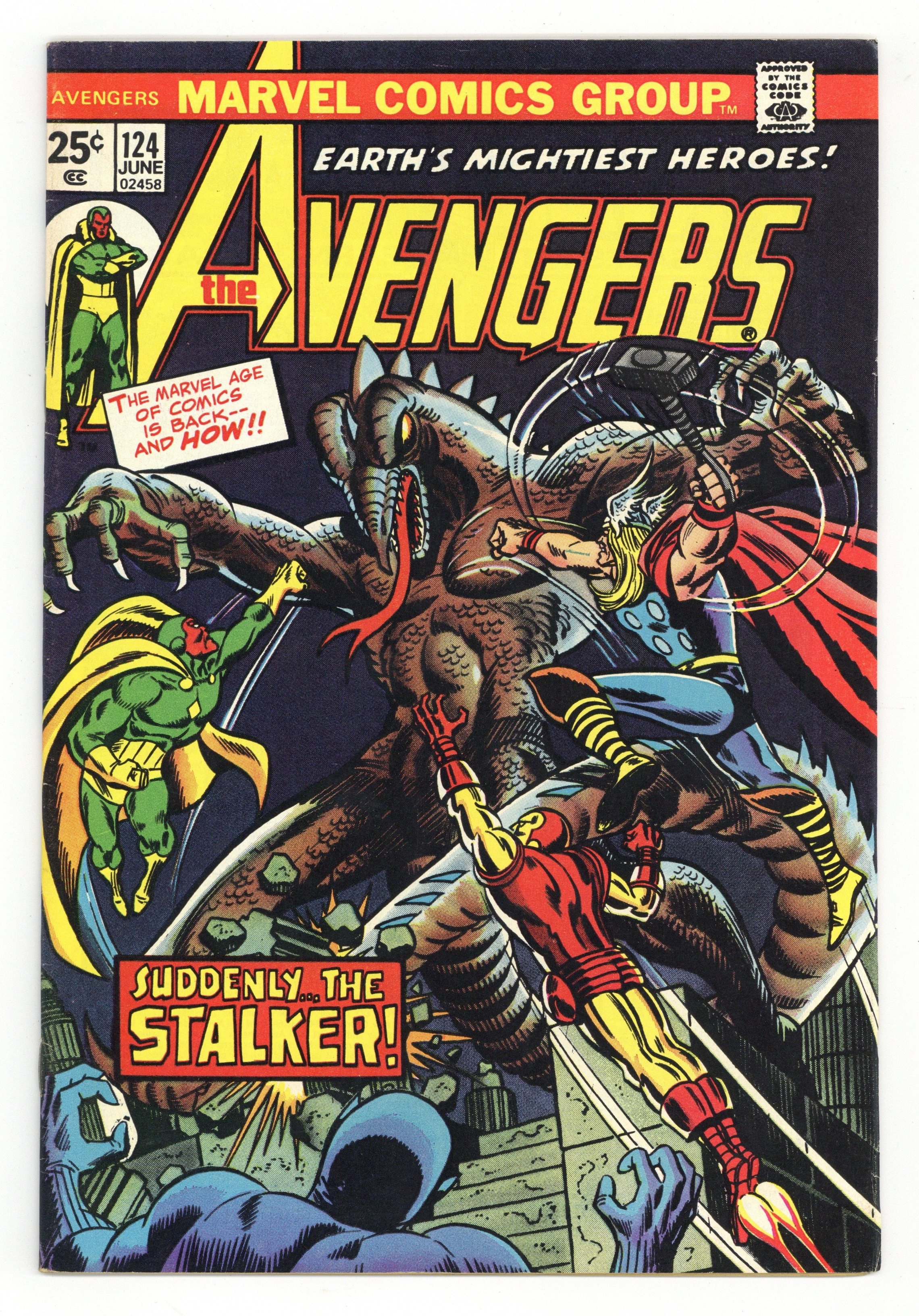 "Beware the Star-Stalker!" Part 2 of 2. Script by Steve Englehart. Art by John Buscema (breakdowns) and Dave Cockrum (finishes). Cover by John Romita and Frank Giacoia. The monster inside the Priests of Pama's temple stands revealed! It's the Star-Stalker! The ion-fueled creature from beyond the stars thrashes Earth's Mightiest Heroes and sends them running from the temple! The Avengers and Libra know they need more firepower, so the Black Panther arranges for Taurus' star-blaster to be flown to Vietnam! But when the Star-Stalker emerges from his cocoon, he crushes the powerful weapon and gets back to pounding the Avengers! Does this awesome beast have any weaknesses? If so, Mantis and the Vision better find it fast! Cameo appearance by Cornelius Van Lunt. Flashback cameo by the Zodiac and the Supreme Intelligence. (Notes: The letters page includes an essay from Stan Lee and Roy Thomas explaining the recent cover price increase to 25ยข. The letters page also contains Marvel Value Stamp Series A #81 Rhino.) 36 pages Cover price $0.25. Grade: FN 6.0 explanation of grade Condition: Used (collectible)