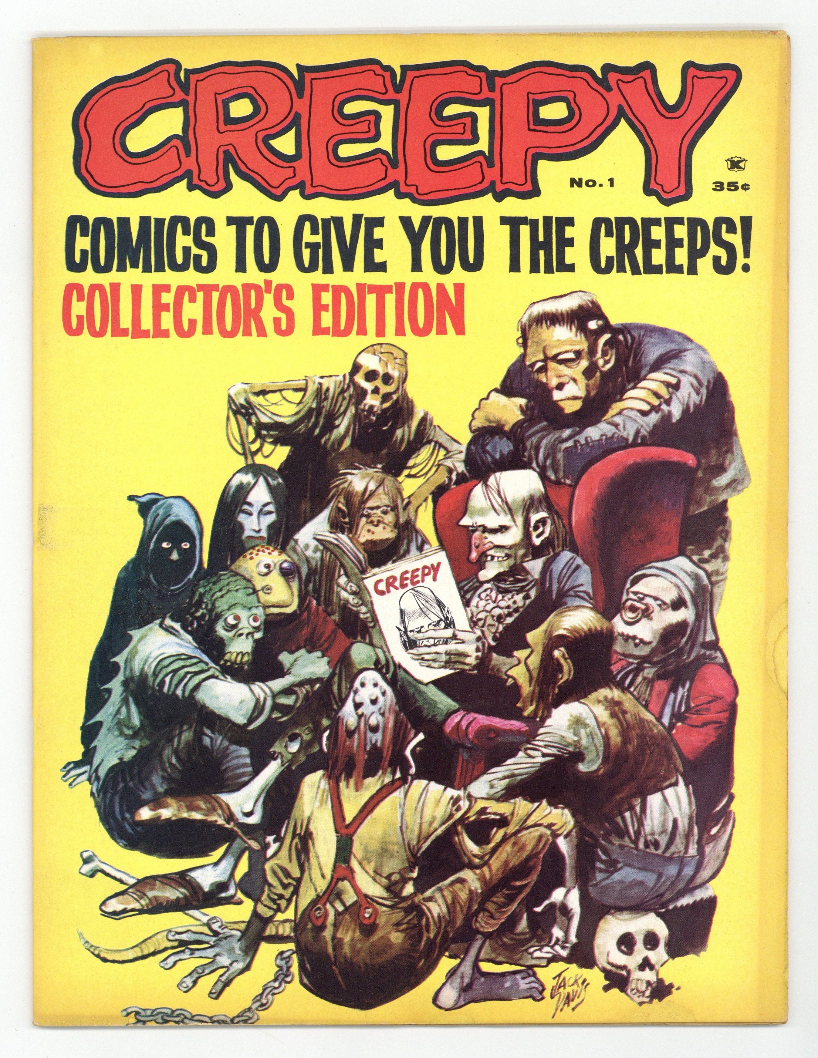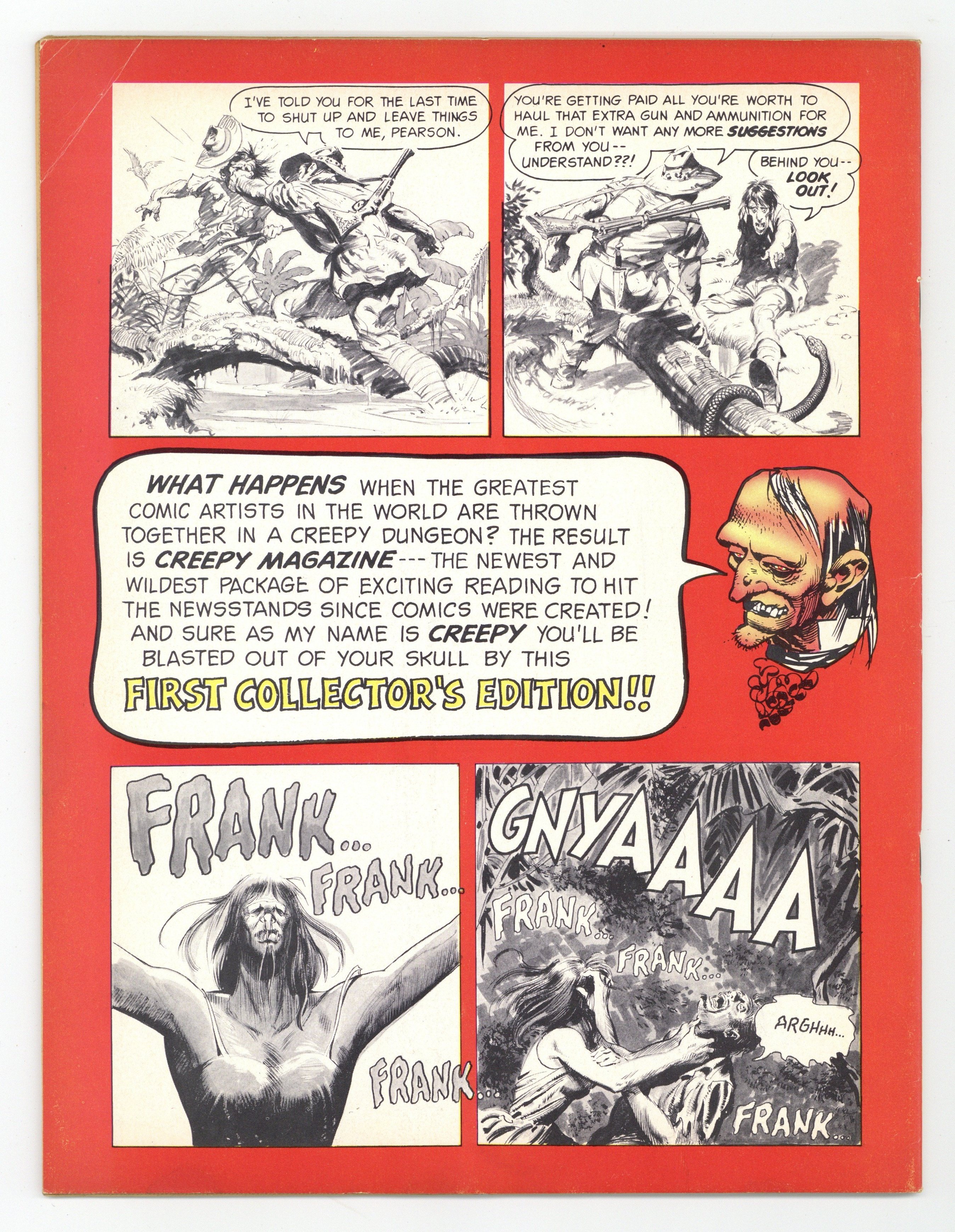 When the Comics Code Authority cracked down on the comic book industry in 1955, horror comics all but faded from the scene. Enter Creepy magazine, publisher James Warren's tribute (after a fashion) to EC's vaunted horror comics line, which couldn't survive the Code's strong arm censorship tactics. Magazines weren't subject to the same rules, giving Warren the freedom to publish more mature content. Eerie, Vampirella, and other Warren publications followed. Stories in this first issue of Creepy include: Voodoo by Bill Pearson and Joe Orlando; H2O World! by Larry Ivie, Al Williamson, and Roy G. Krenkel; Vampires fly at Dusk! by Archie Goodwin and Reed Crandall; Werewolf! by Larry Ivie and Frank Frazetta; Bewitched! by Larry Ivie and Gray Morrow; The Success Story by Archie Goodwin and Al Williamson; and Pursuit of the Vampire! by Archie Goodwin and Angelo Torres. Features the first appearance of Uncle Creepy. Cover art by Jack Davis. Cover price $0.35. Grade: VG/FN 5.0 explanation of grade Condition: Used (collectible)
