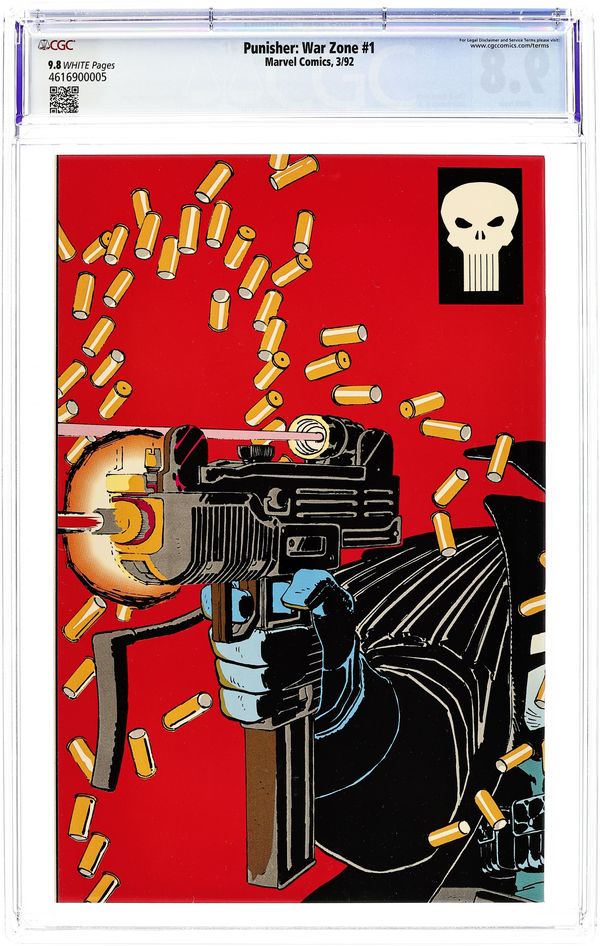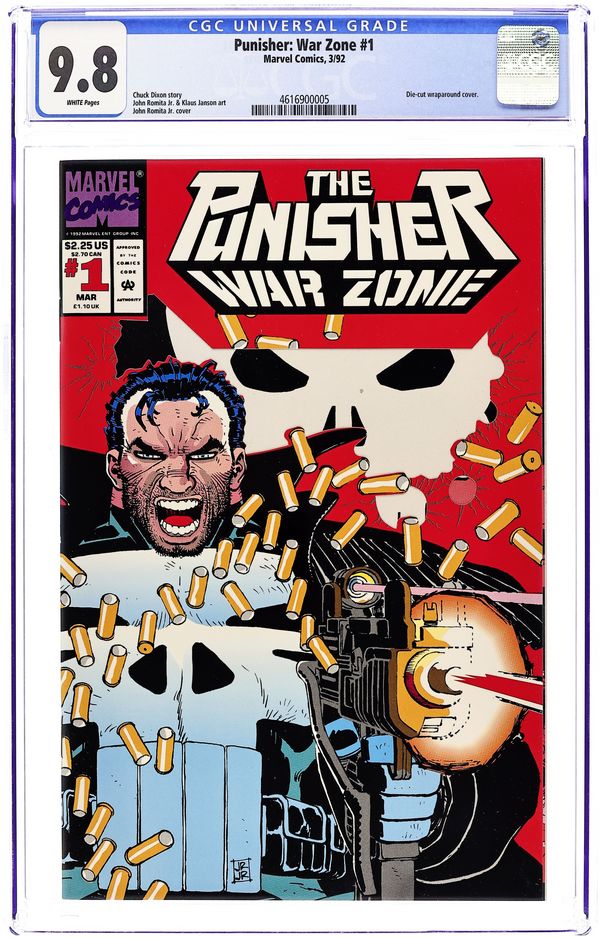 Direct Edition. Die-Cut Wraparound Cover by John Romita Jr.. Only the Dead Know Brooklyn, script by Chuck Dixon, pencils by John Romita Jr., inks by Klaus Janson; Punisher follows Microchip, who's seeing a psychiatrist; Punisher goes undercover and is introduced to the Carbone family as Johnny Tower. 40 pgs. $2.25. Cover price $2.25. Grade: CGC 9.8 explanation of grade Condition: Used (collectible)