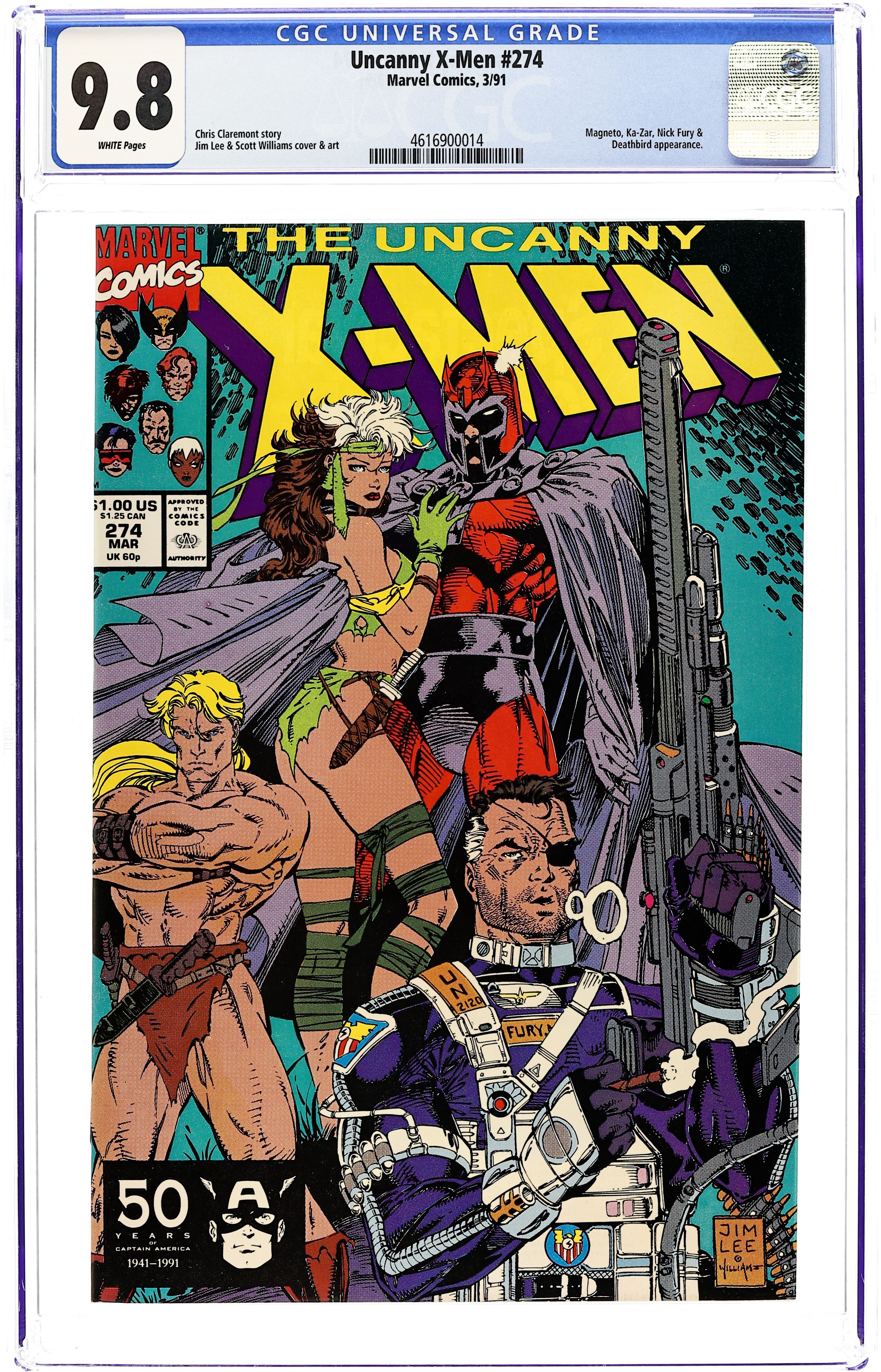Direct Edition. "Capital Crimes!" Part 1 of 4. Guest-starring Nick Fury and Ka-Zar. Story by Chris Claremont. Art and cover by Jim Lee and Scott Williams. It's an epic battle is being waged in the Savage Land and the future of mankind may rest in the hands of...Magneto?! Meanwhile, the X-Men have arrived on the far side of the universe only to have blundered into the trap of an old and dangerous adversary. 36 pgs. Cover price $1.00. Grade: CGC 9.8 explanation of grade Condition: Used (collectible)