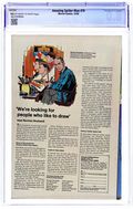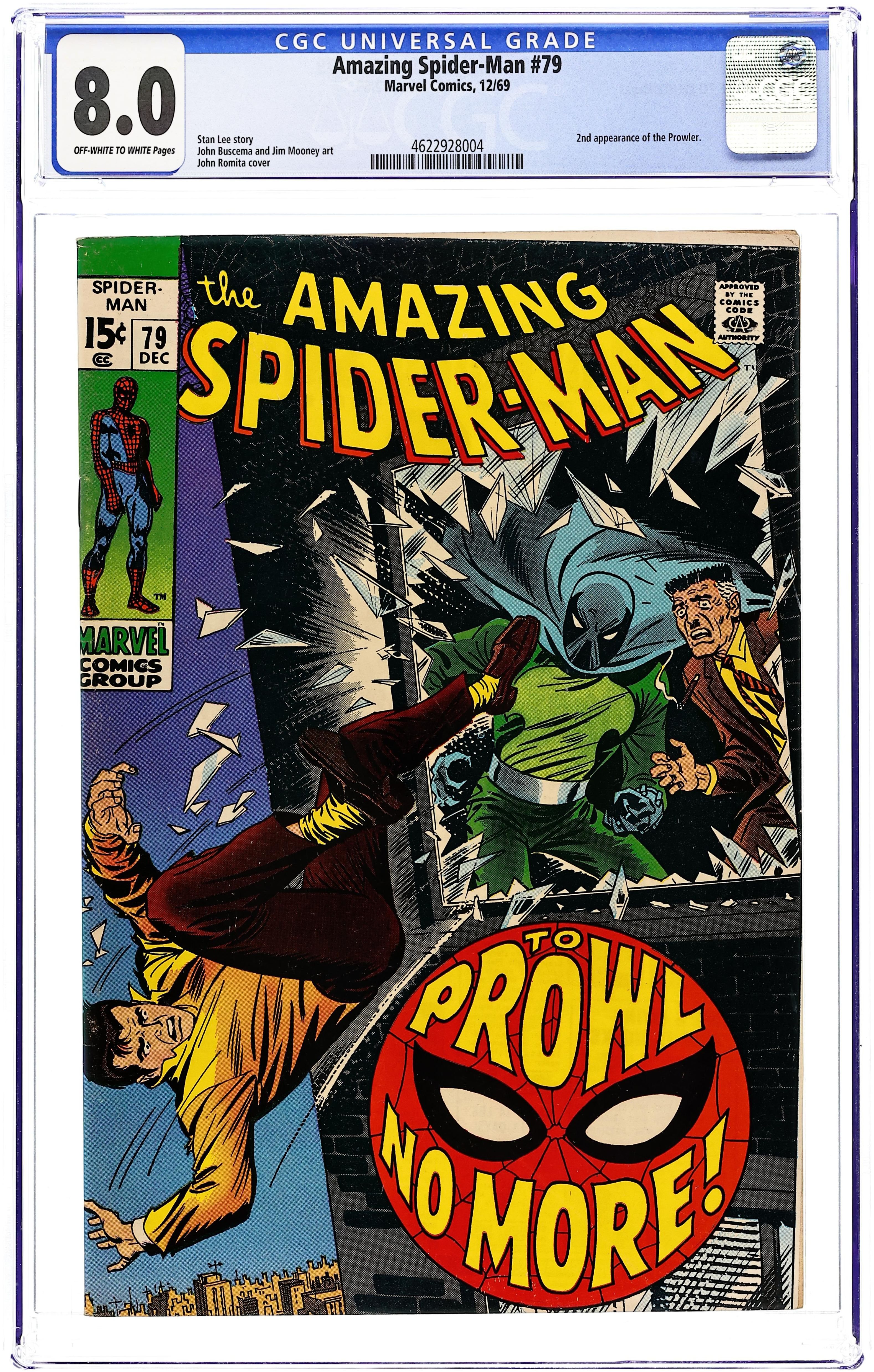"To Prowl No More!" Part 2 of 2. Script by Stan Lee. Art by John Buscema (layouts) and Jim Mooney (finishes). Cover by John Romita. As shown on the frightening cover, Peter Parker falls out of J. Jonah Jameson's office window! But thanks to his ability to cling to surfaces...he survives! And after changing into his costume, Spider-Man welcomes the Prowler to the superhero vs. super-villain business! However during their fight, the web-slinger realizes that he and the Prowler have a lot in common. Perhaps there is a better way to resolve their conflict...and give Hobie Brown a fresh start. Cameo appearances by Gwen Stacy, J. Jonah Jameson, and Joe Robertson. (Notes: The Prowler returns in Amazing Spider-Man #87. This story was reprinted in Marvel Tales #60.) 36 pages. Cover price $0.15. Grade: CGC 8.0 explanation of grade Condition: Used (collectible)