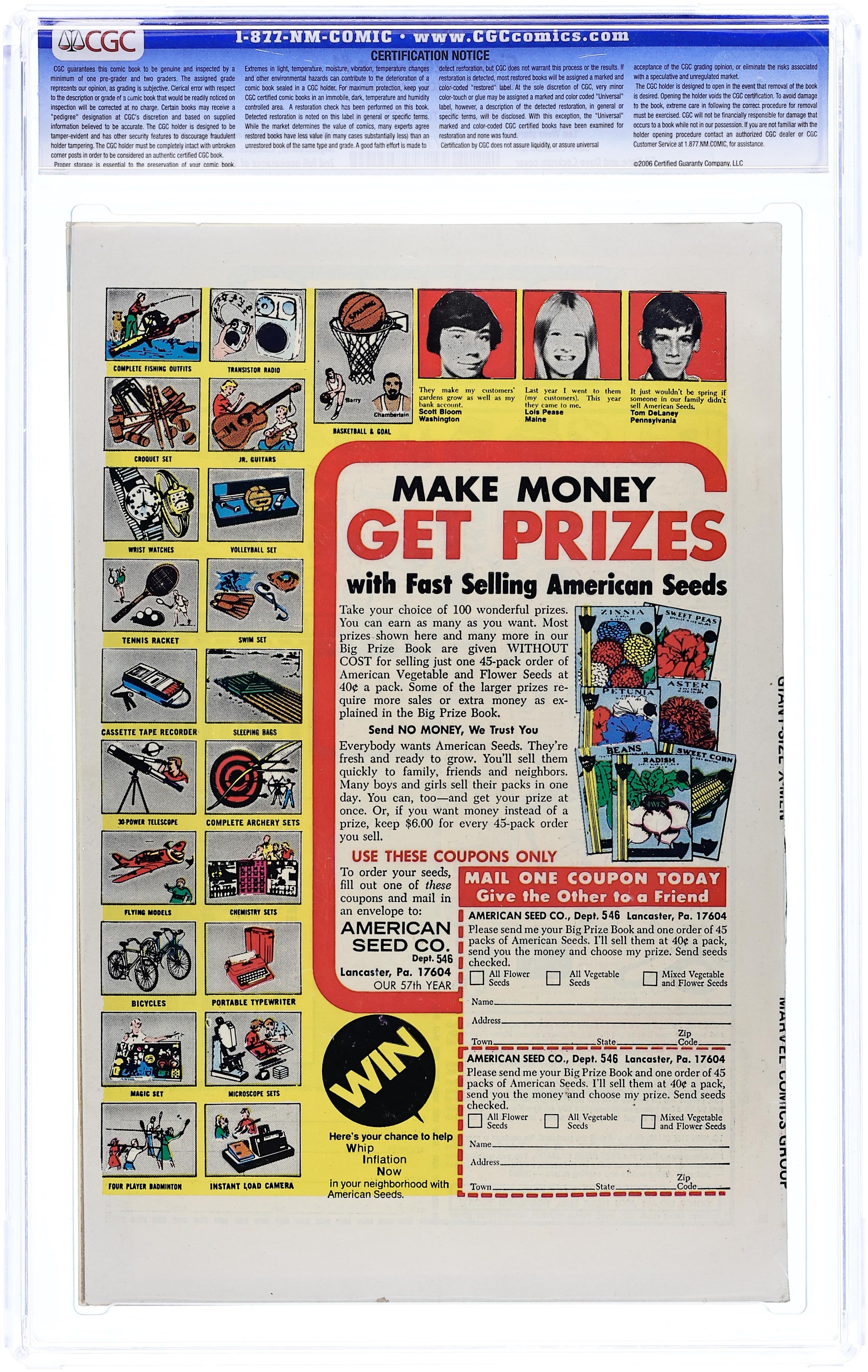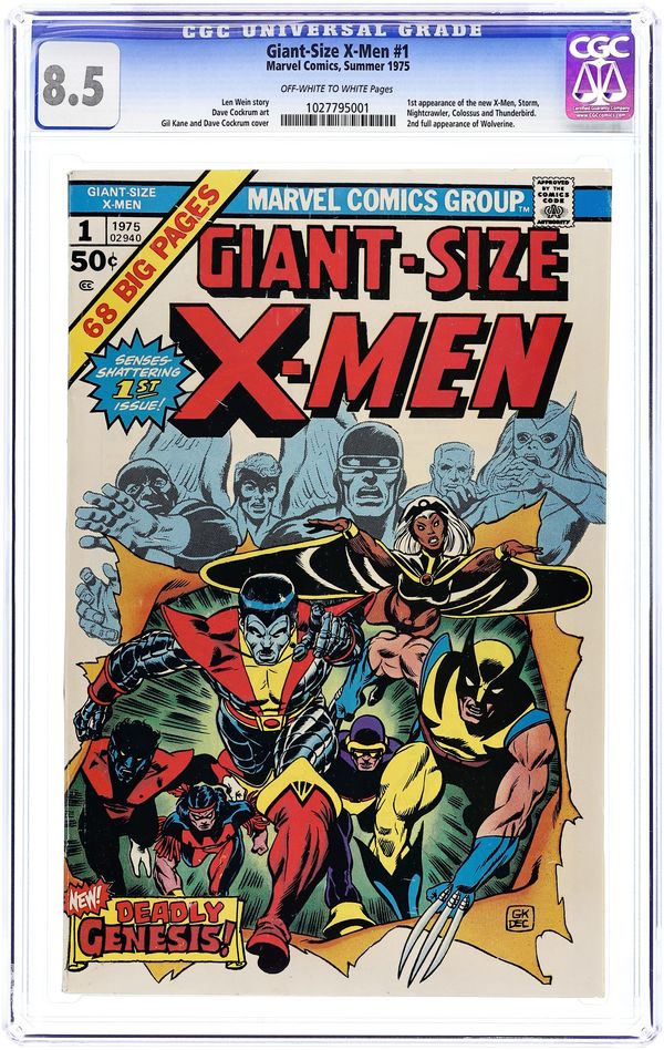 Cover pencils by Gil Kane and Dave Cockrum (original X-Men figures), inks by Dave Cockrum. 1st appearance of the new X-Men in "Second Genesis," script by Chris Claremont (plot assist, uncredited) and Len Wein (plot, script), art by Dave Cockrum; The old X-Men are captured by Krakoa, the Living Island, and Professor X forms a new team to rescue them; First appearances of Nightcrawler, Storm, Colossus, and Thunderbird; 2nd full appearance of Wolverine after Incredible Hulk 181; Appearances of Cyclops, Iceman, the Angel, Marvel Girl, the Banshee, Sunfire, Havok, Lorna Dane, and Mr. Fantastic (of the Fantastic Four); Beast cameo; Continued in X-MEN #94. "Call Him... Cyclops!", script by Roy Thomas, pencils by Werner Roth, inks by John Verpoorten; Explanation of Cyclops' powers. "I, the Iceman," script by Arnold Drake, pencils by Werner Roth, inks by John Verpoorten; Explanation of Iceman's powers. "The Female of the Species!", script by Linda Fite, pencils by Werner Roth, inks by Sam Grainger; Explanation of Marvel Girl's powers. 68 pgs., full color. Cover price $0.50. Grade: CGC 8.5 explanation of grade Condition: Used (collectible)