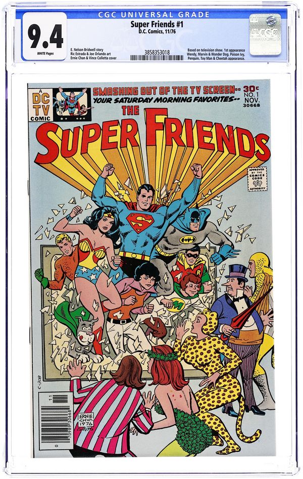 "The Fury of the Super Foes." Aquaman, Batman, Robin, Superman and Wonder Woman attempt to prevent Penguin, Poison Ivy, Cheetah, and others from stealing the components of a super robot. The Super Friends, which are essentially a watered down version of the Justice League, appeared in the Saturday morning animated series of the same name. Script by E. Nelson Bridwell, pencils by Ric Estrada and Joe Orlando, inks by Vince Colletta. Cover by Ernie Chua. Cover price $0.30. Grade: CGC 9.4 explanation of grade Condition: Used (collectible)