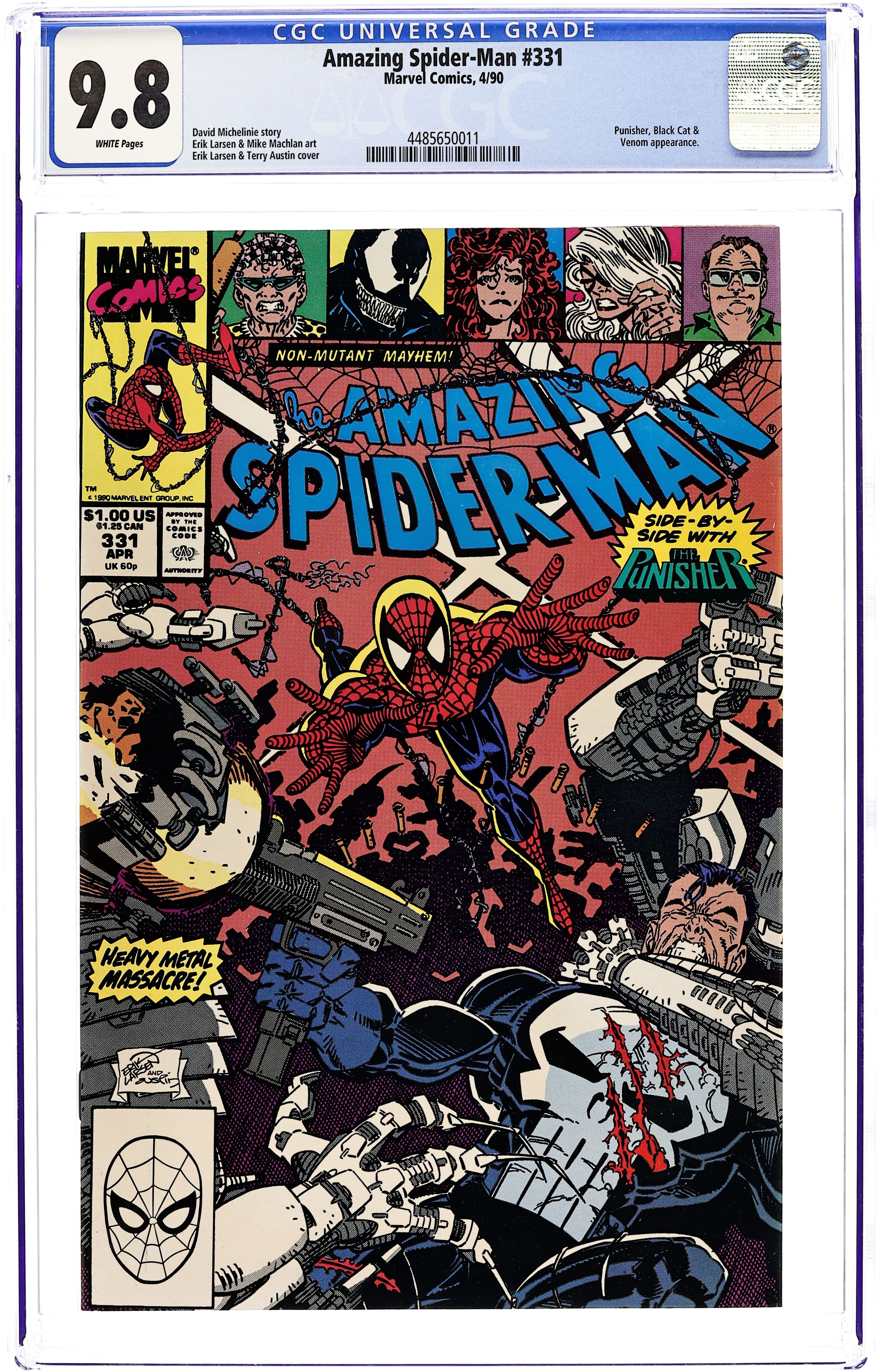 Direct Edition. "The Death Standard" Part 2 of 2. Guest-starring the Punisher. Script by David Michelinie. Pencils by Erik Larsen. Inks by Mike Machlan. Cover by Erik Larsen and Terry Austin. To destroy the largest cocaine stockpile in the United States, the Punisher and the wondrous wall-crawler break into a secret federal installation in upstate New York! The web-slinger can't believe the government has joined the drug trade! But the Punisher doesn't care who's doing what! He's going to obliterate those drugs or die trying! Meanwhile in Colorado, Venom escapes from the Vault again! And in Soho, the Black Cat scares Mary Jane! Big problems are looming for your friendly neighborhood Spider-Man next issue! Cameo appearance by Microchip. (Note: Spider-Man and the Punisher previously worked together in Punisher War Journal (1988 1st series) 14 & 15.) 36 pages. Cover price $1.00. Grade: CGC 9.8 explanation of grade Condition: Used (collectible)