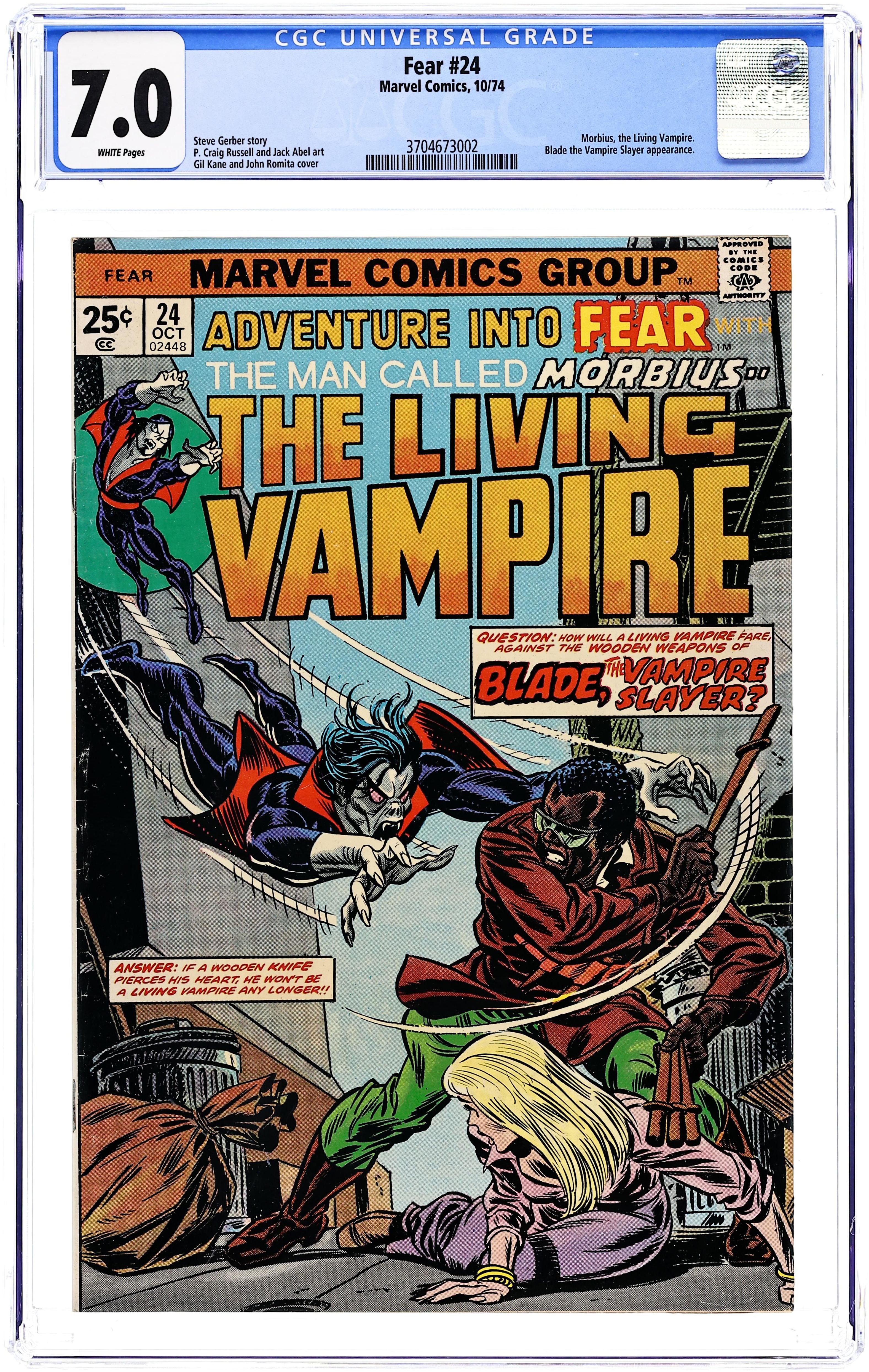 Morbius battles Blade the Vampire Slayer in "Return to Terror!" Script by Steve Gerber, pencils by Craig Russell, inks by Jack Abel. The letters page contains Marvel Value Stamp series A # 38 (Red Sonja by Barry Windsor-Smith). Reprint back-up story: "The Two-Faced Man" with art by Joe Maneely (from World of Suspense 1). Gil Kane cover pencils (John Romita Sr. inks?). Cover price $0.25. Grade: CGC 7.0 explanation of grade Condition: Used (collectible)