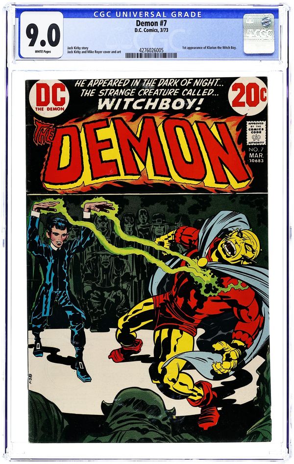 Merlin has stationed his guardian Demon, Etrigan at the forefront to protect mankind from the denizens of the Nether World and the things that go bump in the night. Sometimes even he needs help. Enter: Klarion the Witchboy. "A Witchboy!" Story and art by Jack Kirby. Cover price $0.20. Grade: CGC 9.0 explanation of grade Condition: Used (collectible)