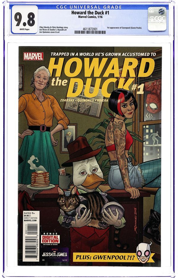 1st appearance of Gwenpool. Written by Chip Zdarsky. Art and Cover by Joe Quinones. First spectacular issue! A great jumping on point! Sure to go up in value! Don't miss out on the series everyone is calling 'Howard the Duck'! The last page will shock you! Nothing will EVER be the same again! Hey! Where are you going? Come back! Waugh! 36 pages, full color. Rated T+ Cover price $4.99. Grade: CGC 9.8 explanation of grade Condition: Used (collectible)