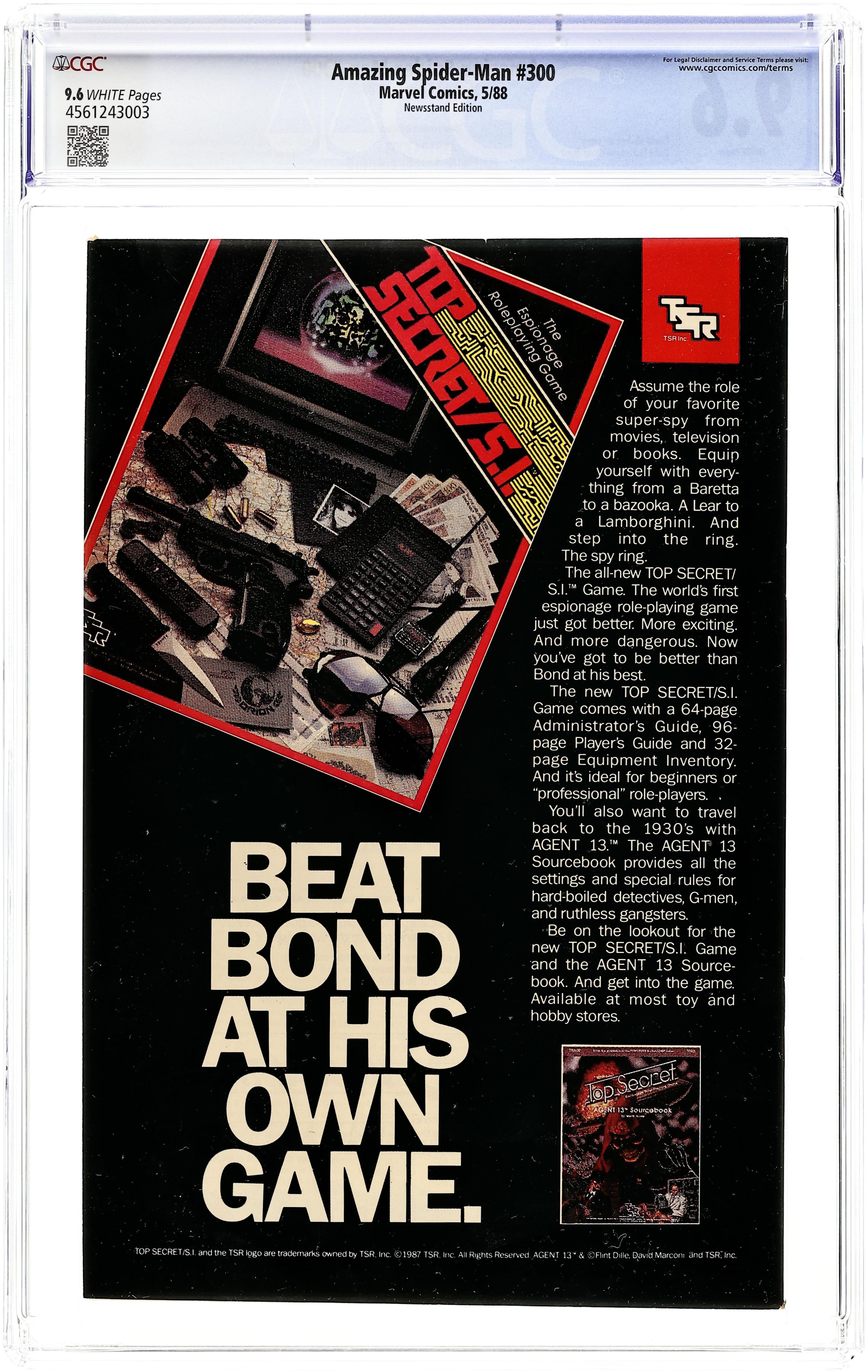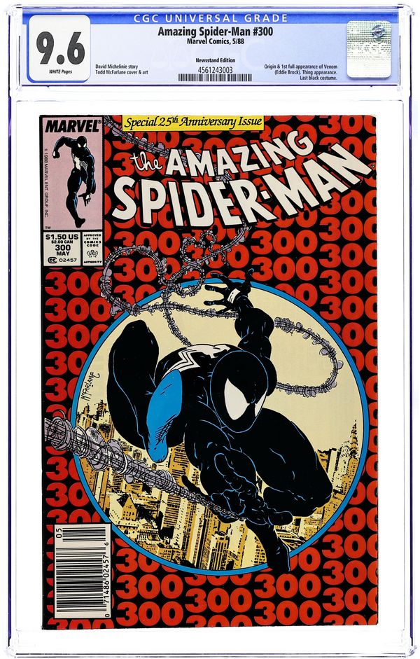 Newsstand Edition. Giant-sized 25th anniversary issue. First full appearance of Venom in "Venom!", script by David Michelinie, art by Todd McFarlane; Spidey's old alien costume has merged with reporter Eddie Brock who thinks his career was ruined by Spider-Man and the symbiote of the two, Venom, takes on the web slinger; At MJ's request, Spidey returns to the blue and red costume as she now finds his black duds way too creepy; This is the last issue in which Spider-Man appears in his black costume; Thing (of the Fantastic Four) cameo.. Stan's Soapbox Special in place of letters page: Full page editorial by Stan on the occasion of Spider-Man's 300th issue. 52 pgs., full color. Cover price $1.50. Grade: CGC 9.6 explanation of grade Condition: Used (collectible)